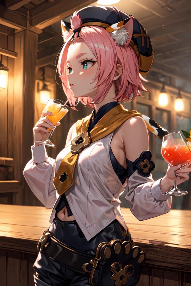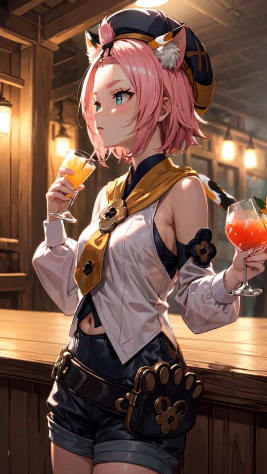 1girl, animal ear fluff, animal ears, bangs pinned back, bare shoulders, belt, black headwear, black shorts, blush, cat ears, cat girl, cat tail, cocktail glass, cowboy shot, cup, detached sleeves, drink, drinking glass, forehead, green eyes, hat, holding, holding cup, holding drink , indoors, long sleeves, looking away, navel, necktie, parted lips, pink hair, pouch, shirt, short hair, shorts, sleeveless shirt, small breasts, solo, standing, tail, thick eyebrows