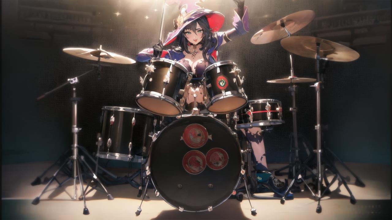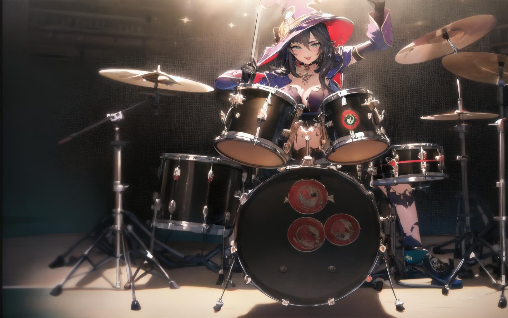 | Prompt | (perfect artwork), best quality,,(8k), (4k),(Masterpiece), (Best Quality), hyper detailed, (perfect face), illustration, clearly worked out detail, intricate, cinematic,(depth of field), <lora:mona1:1>(monadef), asymmetrical bangs,black choker,,covered navel,crescent,crescent hat ornament,red cape,single earring,v-shaped eyebrows, inside a crowded concert hall, sunlights, ((punk attire, black tattoos)), happy, tongue out, (playing battery, holding drumsticks), |