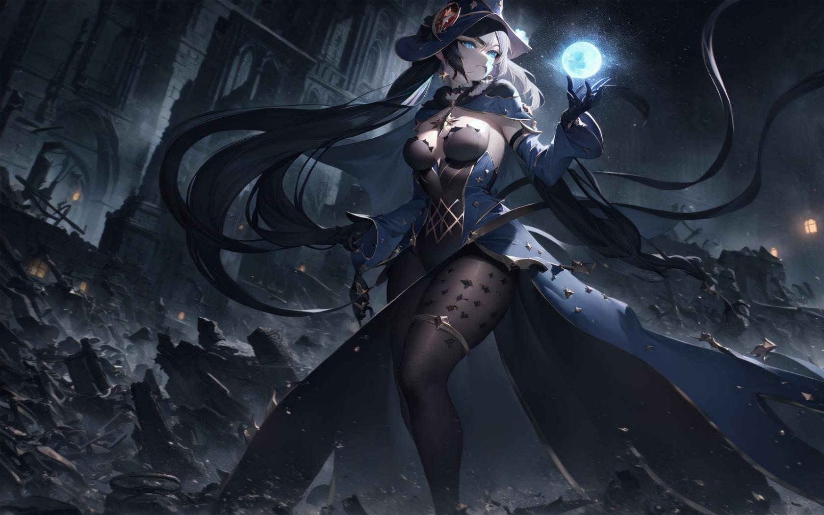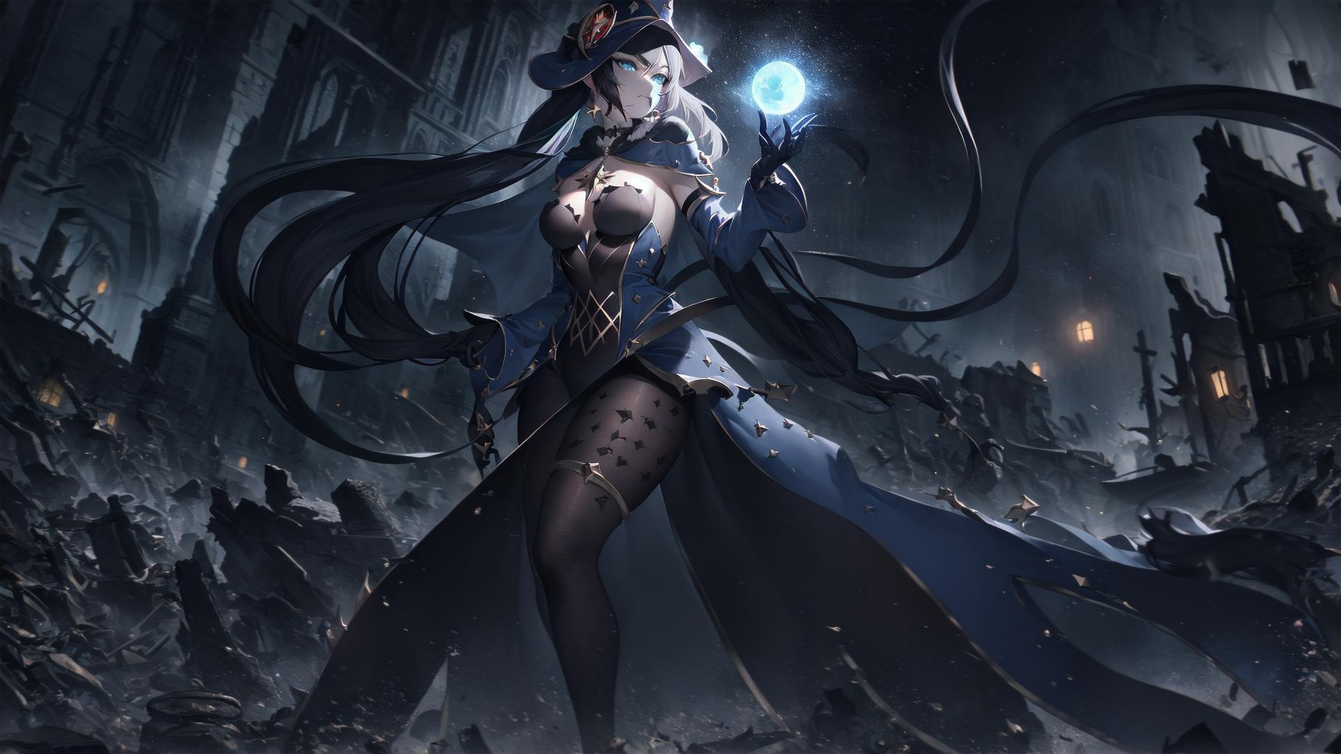 | Prompt | (dark fantasy art,apocalyptic art,highly detailed:1.5), (black and blue theme:1.3), (perfect artwork), best quality,,(8k), (4k),(Masterpiece), (Best Quality), hyper detailed, (perfect face), illustration, clearly worked out detail, intricate, cinematic,(depth of field), <lora:mona1:1>(monarnd), asymmetrical bangs,black choker,(mouth,closed mouth),covered navel,crescent,crescent hat ornament,red cape,single earring,v-shaped eyebrows,cape, ((black witch hat)), black silk dress, ornate dark blue dress, moon, dark sky,moonrays, holding glowing orb of water, walking in water, wasted lands, ruins of medieval town, powerful, angry, looking at viewer, |