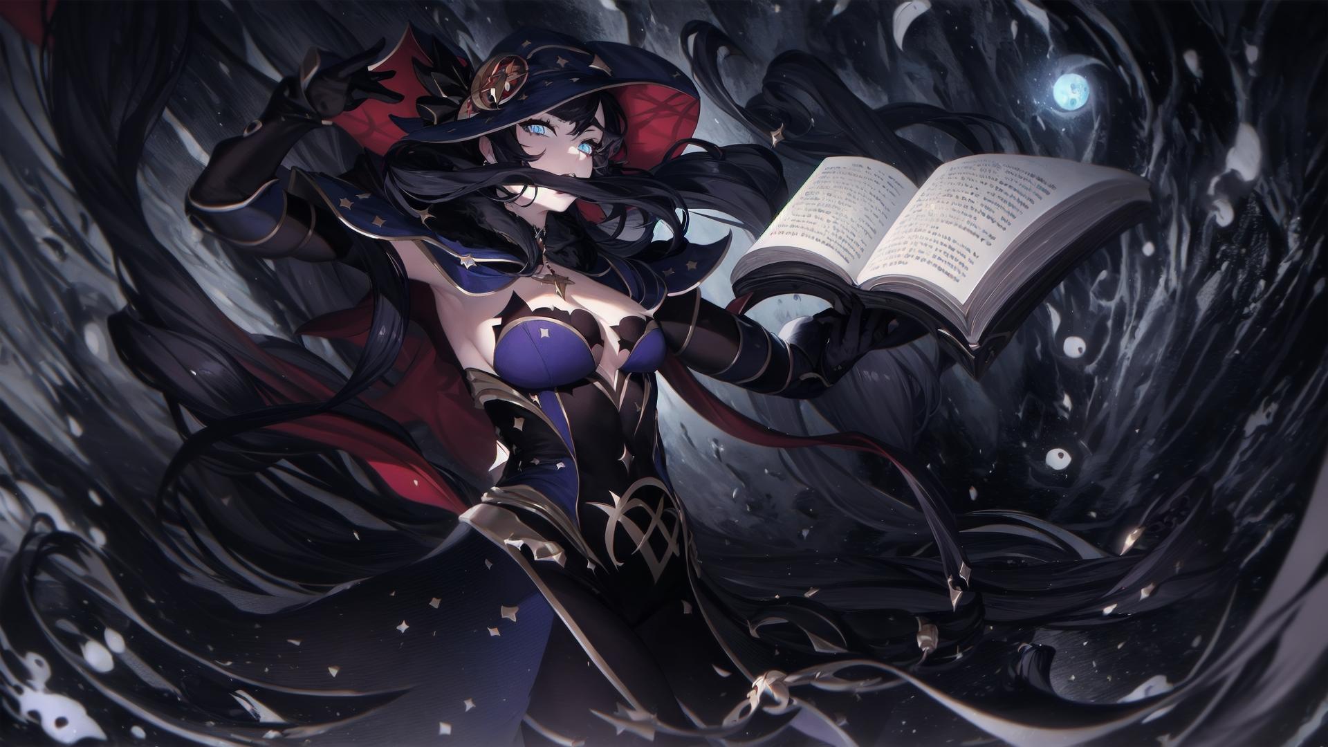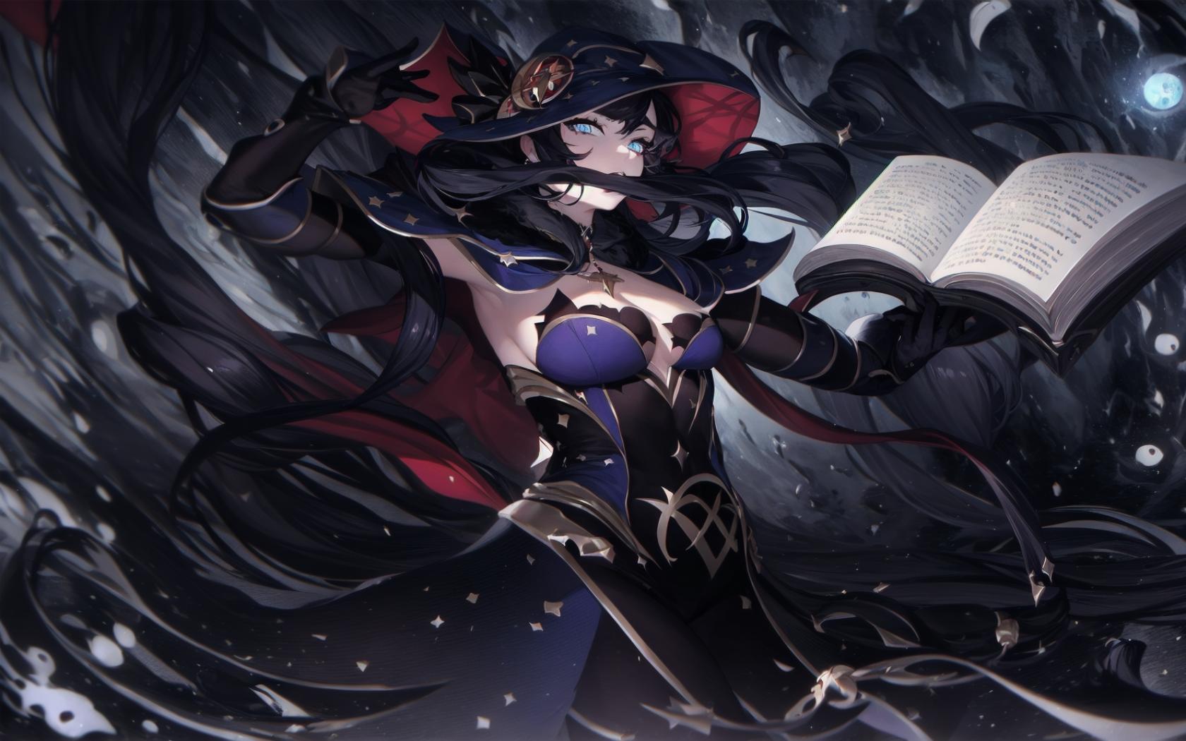 Prompt (dark fantasy art,apocalyptic art,highly detailed:1.2), (black and blue theme), (perfect artwork), best quality,,(8k), (4k),(Masterpiece), (Best Quality), hyper detailed, (perfect face), illustration, clearly worked out detail, intricate, cinematic,(depth of field), <lora:mona1:1>(monarnd), asymmetrical bangs,black choker,(mouth,closed mouth),covered navel,crescent,crescent hat ornament,red cape,single earring,v-shaped eyebrows,cape, inside cemetary, ((black witch hat)), black silk dress, ornate dark blue dress, moon, dark sky,moonrays, reading satanic black book, ((floating skulls)), wasted lands, ruins of medieval town, evil, glowing eyes,