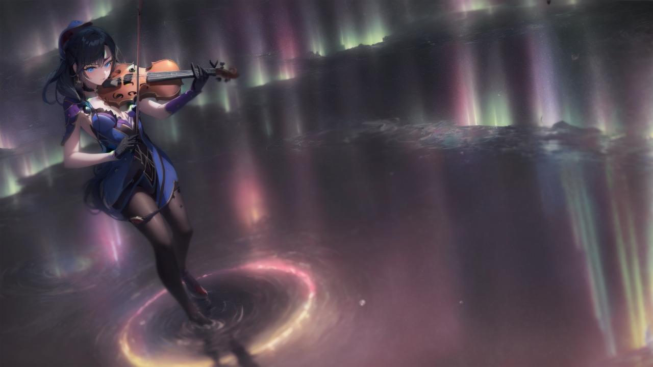 a woman that is playing violin near the aurora lights of lights in the sky behind her are other people on stage in front of the camera with music