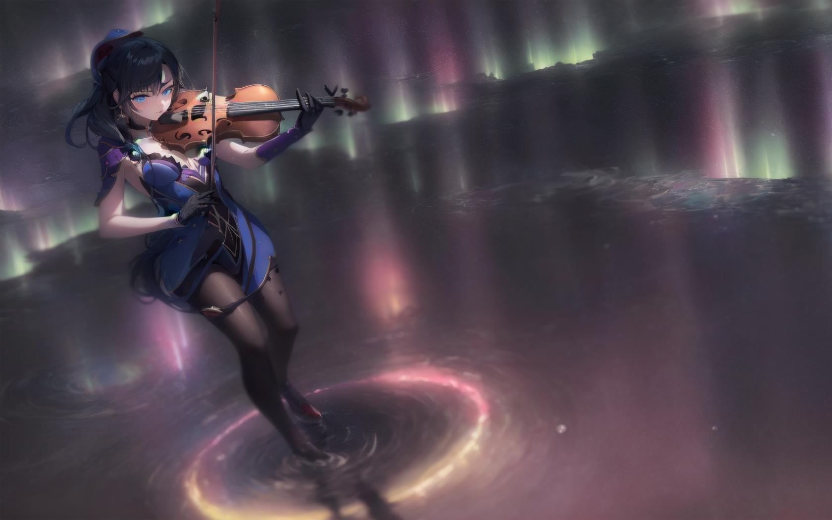 Prompt (dramatic, romantic, anime,highly detailed:1.5), (perfect artwork), best quality,,(8k), (4k),(Masterpiece), (Best Quality), hyper detailed, (perfect face), illustration, clearly worked out detail, intricate, cinematic,(depth of field), <lora:mona1:1>(monadef), asymmetrical bangs,black choker,(mouth,closed mouth),covered navel,crescent,crescent hat ornament,red cape,single earring,v-shaped eyebrows, playing violin,walking above the earth,((witch hat)),black pantyhose,bare legs, ((vivid colors,galaxy background,aurora borealis,sky,glowing blue)), walking top of the world, water effect, water droplets, sad, , 1girl, bangs, black hair, blue dress, blue eyes, bow \(instrument\), dress, flute, gloves, guitar, holding instrument, instrument, lake, long hair, looking at viewer, music, ocean, playing instrument, reflection, ripples, river, singing, solo, standing, standing on liquid, violin, wading, water, waves