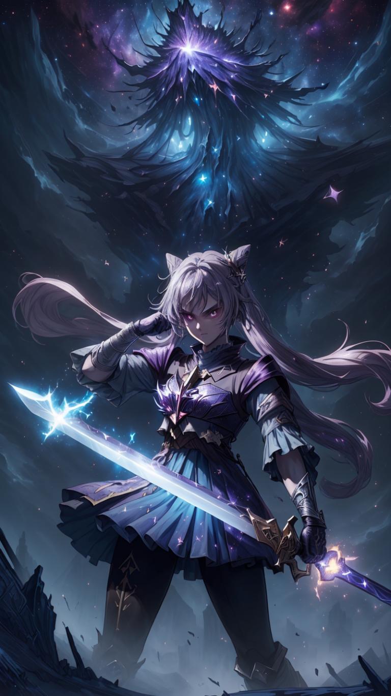 BREAK (epic,heroic fantasy:1.7), (anime art,magical realism:1.4), ((eerie lighting)), ,best quality,dynamic pose,sharp focus,(8k), (4k),(Masterpiece), (Best Quality), fantasy, extremely detailed, intricate, hyper detailed, (perfect face), <lora:more_details:0.3> <lora:kVoidEnergy-000001:0.4>glowing purple v0id3nergy, |