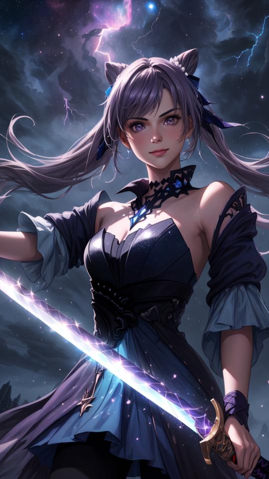 1girl, bangs, bare shoulders, black dress, black pantyhose, cleavage, closed mouth, cloud, cloudy sky, cone hair bun, cowboy shot, detached collar, detached sleeves, double bun, dress, earrings, electricity, hair bun, hair ornament, holding, holding sword, holding weapon, jewelry, lightning , long hair, looking at viewer, medium breasts, night, night sky, official alternate costume, pantyhose, purple eyes, purple hair, sky, smile, solo, standing, strapless, strapless dress, swept bangs, sword, twintails, weapon