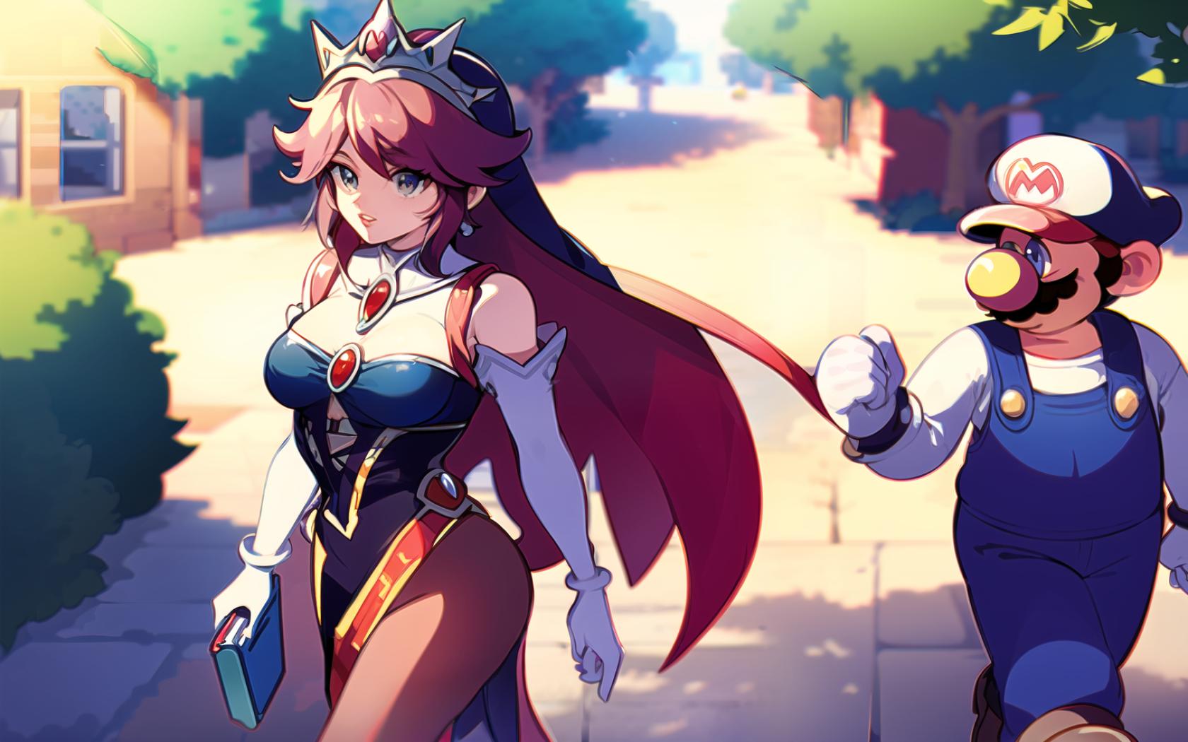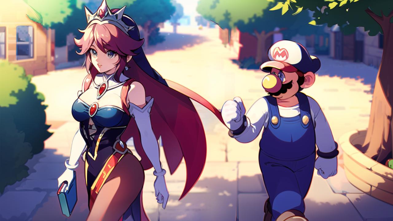 two anime characters being seen coming away from the town side street with their hats on and they are dressed very casual and dressed like mario bros versions