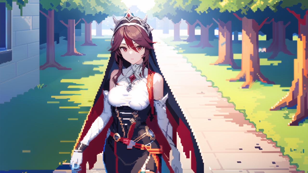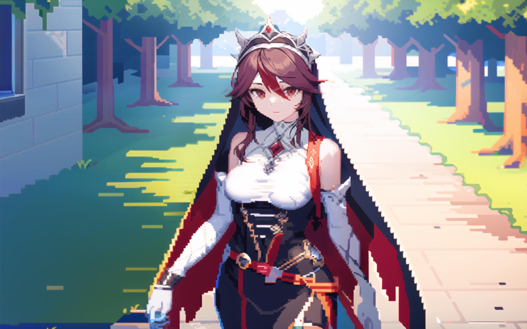 | Prompt | (pixel art, 8 bit art:1.4), <lora:rosaria0.85dim32:1>, rosariarnd, tiara, headdress, (medium breast), sun, sunny day, trees, walking in the street of a medieval town, cowboy shot, portrait, headshot, |