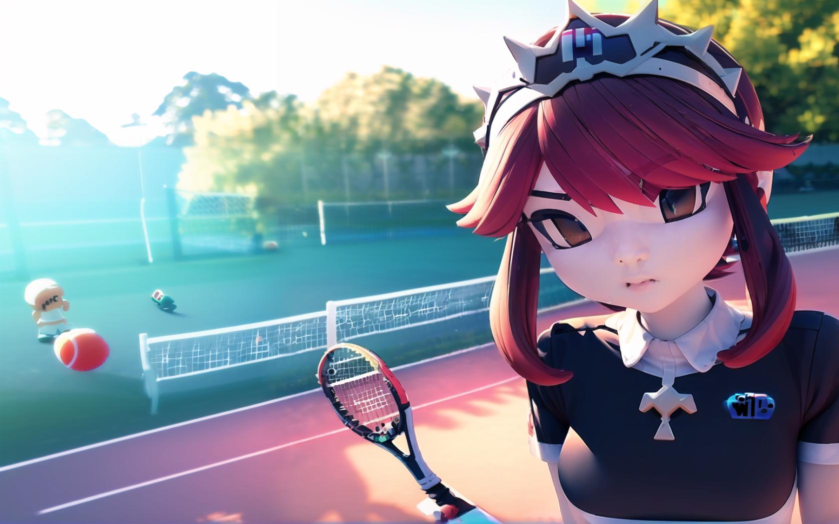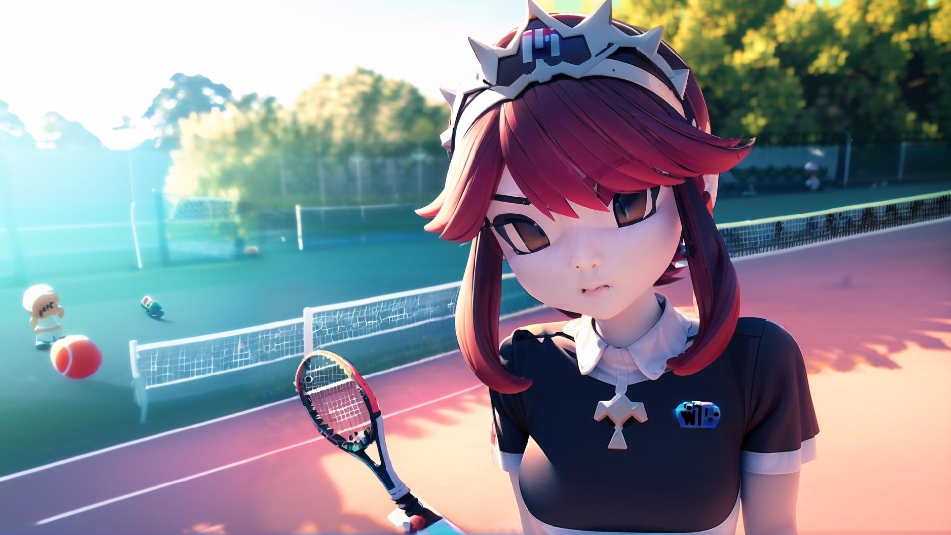 animated picture of anime character playing tennis on court with ball in air and net in background, and woman is wearing tennis outfit holding racquet