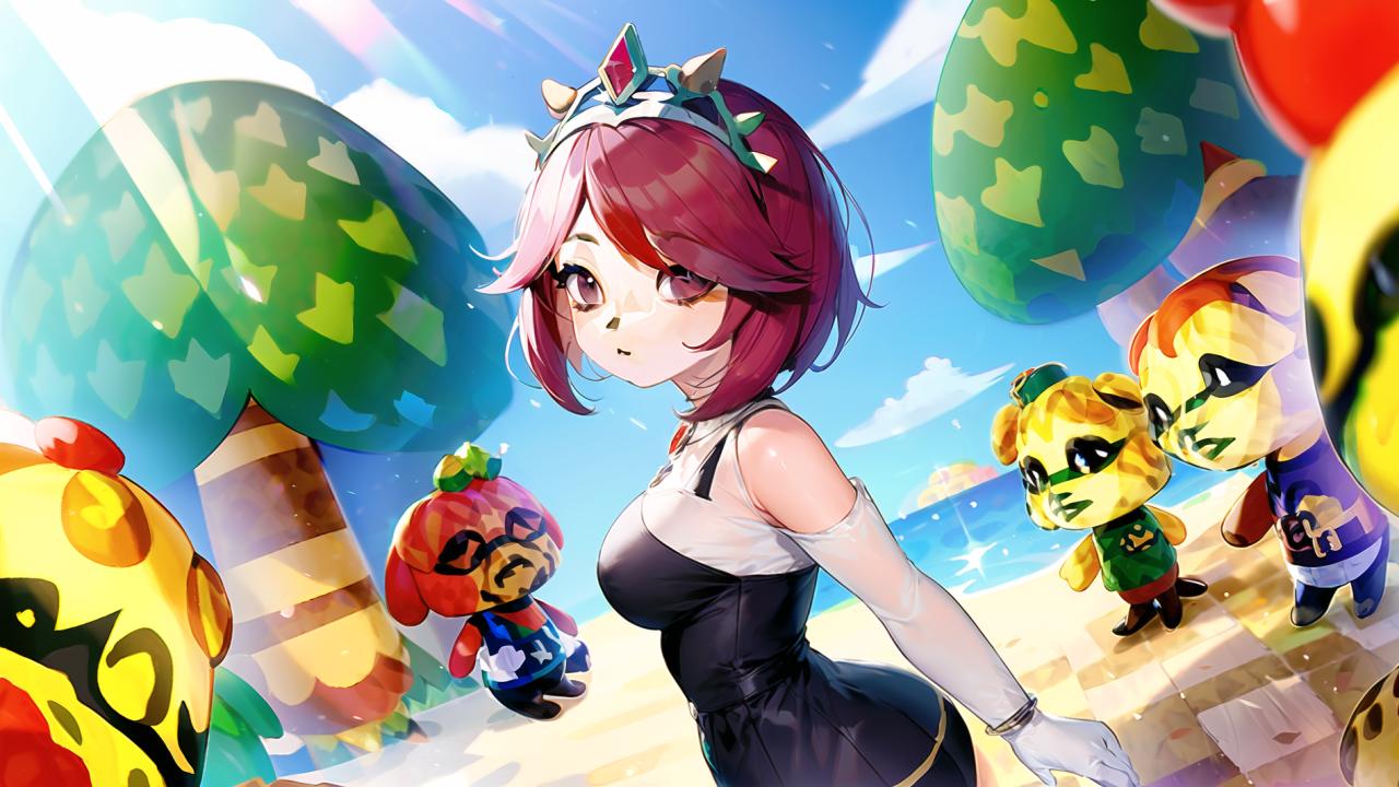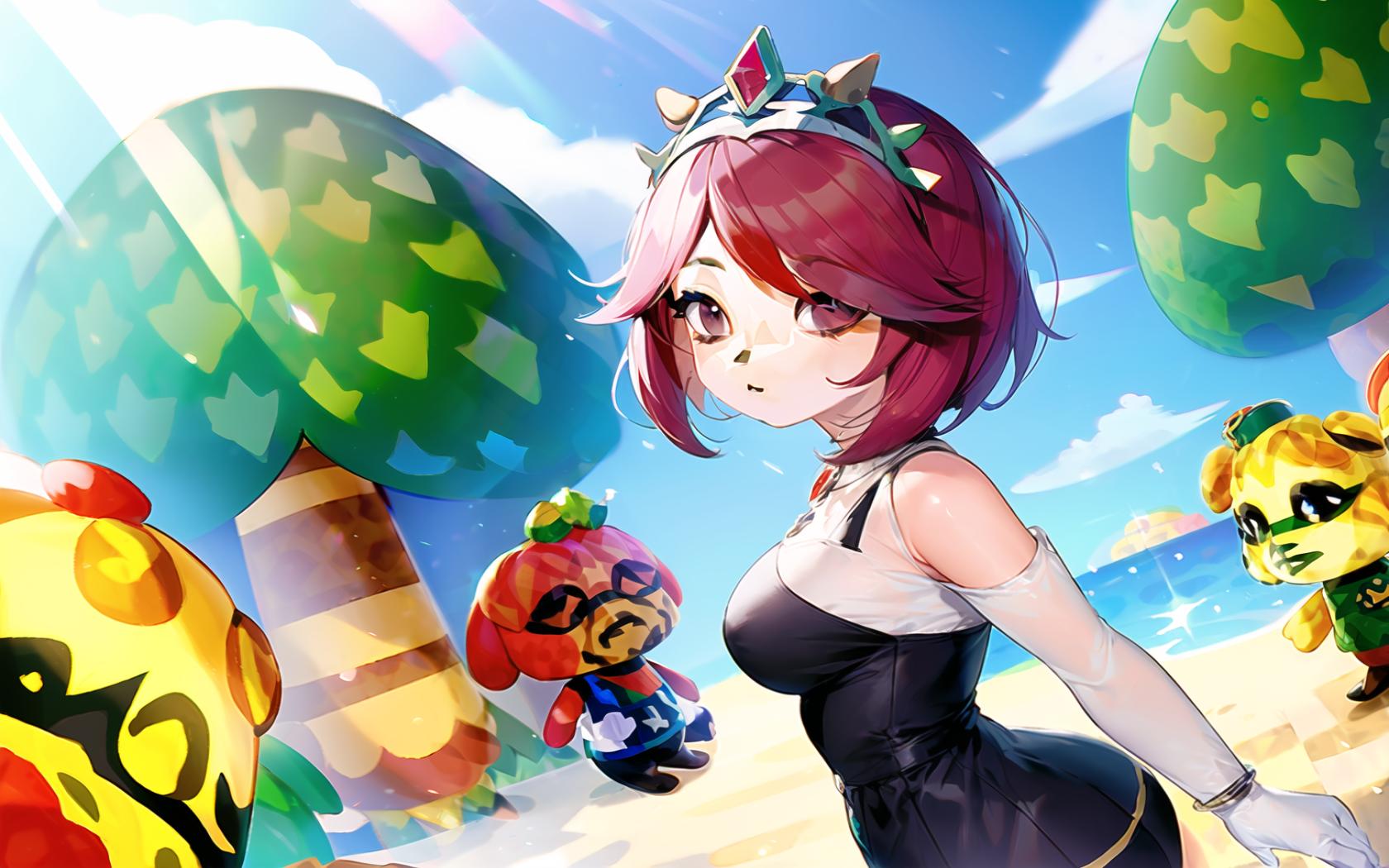 Prompt (Animal Crossing: New Horizons style:1.6), <lora:rosaria0.85dim32:1>, rosariarnd, tiara, headdress, (medium breast), sun, sunny day, trees, walking in the street of a medieval town, cowboy shot, portrait, headshot,