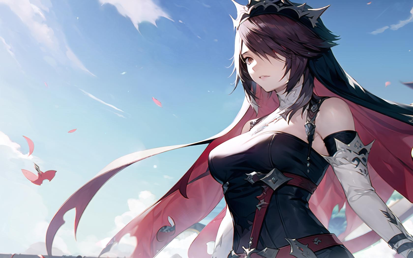 1girl, bangs, bare shoulders, belt, black dress, blue sky, closed mouth, cloud, day, detached sleeves, dress, elbow gloves, gloves, hair over one eye, large breasts, medium breasts, multicolored hair, nun , outdoors, petals, purple hair, red eyes, short hair, sky, solo, streaked hair, upper body, veil, white gloves