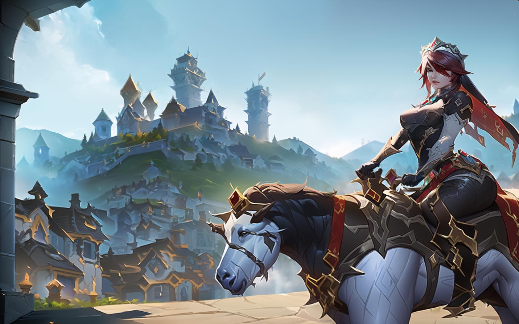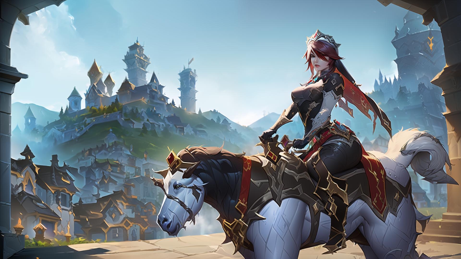 | Prompt | (highly detailed:1.5, realistic:1.5), (world of warcraft videogame art:1.3), (world of warcraft' stormwind town background:1.6), <lora:rosaria0.85dim32:1.1>, (rosariadef:1.4), tiara, headdress,(1girl), (riding a armored white goat), cowboy shot, |