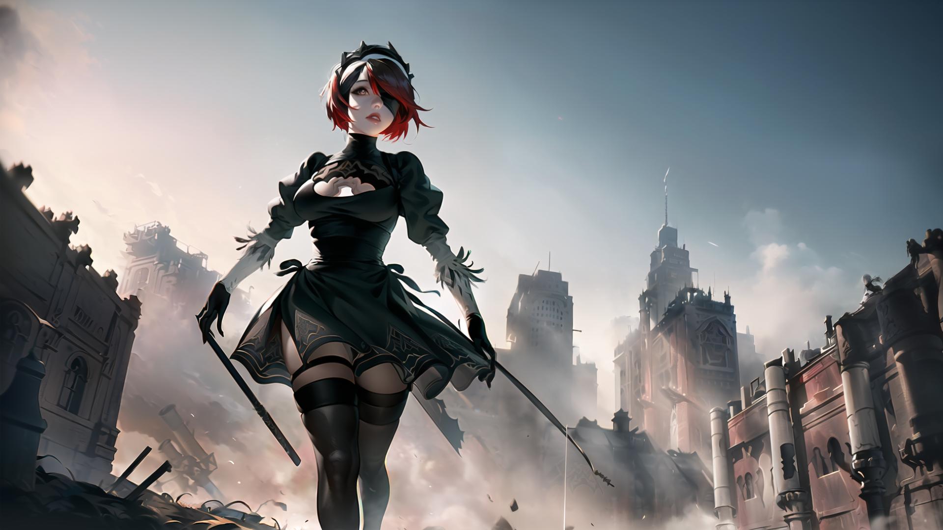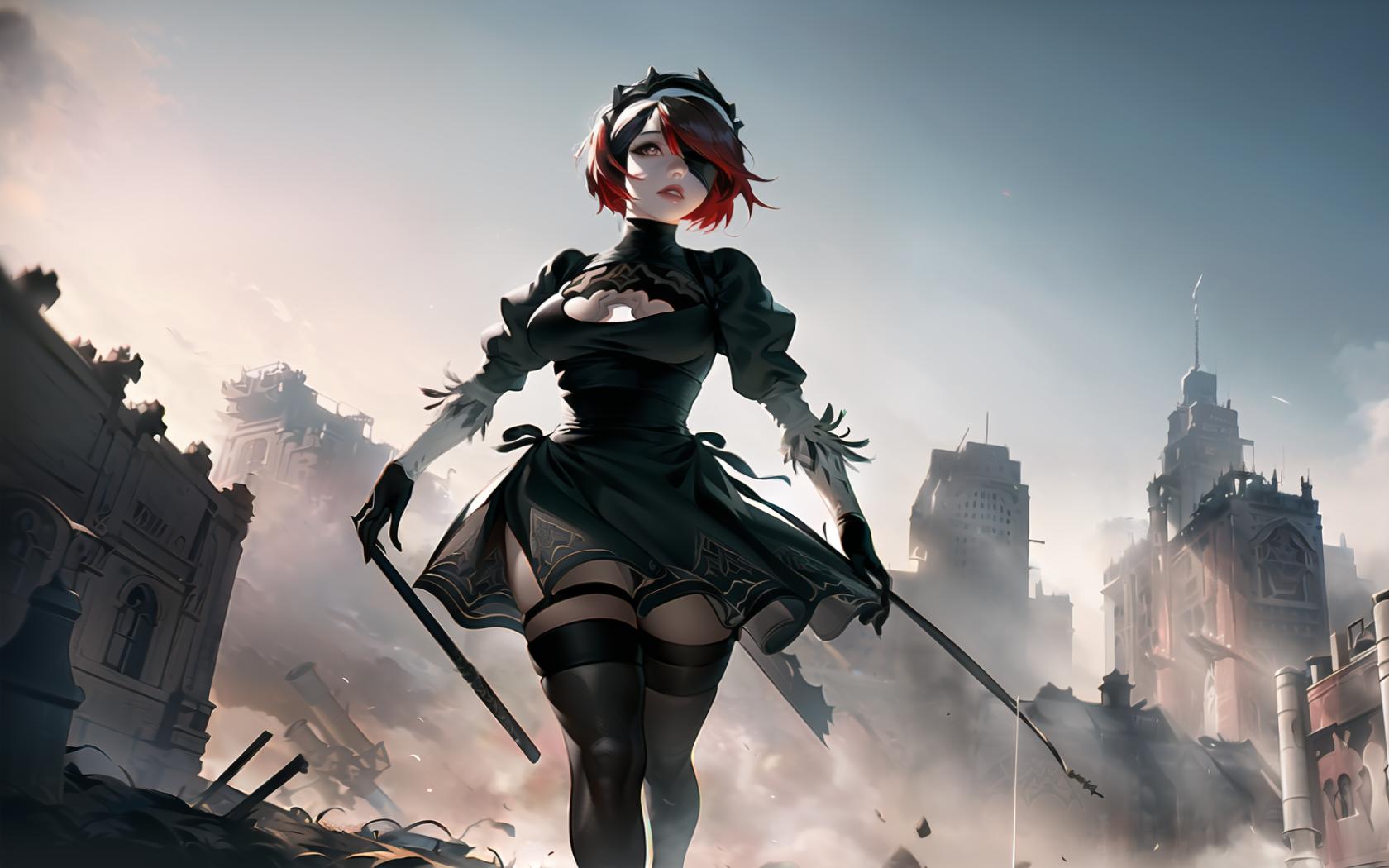| Prompt | (highly detailed:1.5), ),octane render, (apocalyptic art,nier automata videogame art:1.3), (YoRHa No.2 Type B outfit:1.2), dark sky, dramatic, epic, <lora:rosaria0.85dim32:1.1>, (rosariarnd:1.4), (tiara, headdress,red hair:1.2), looking at viewer, full body, heroic pose |