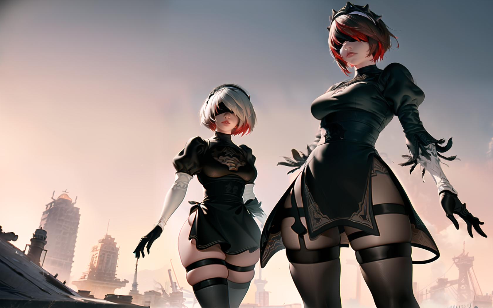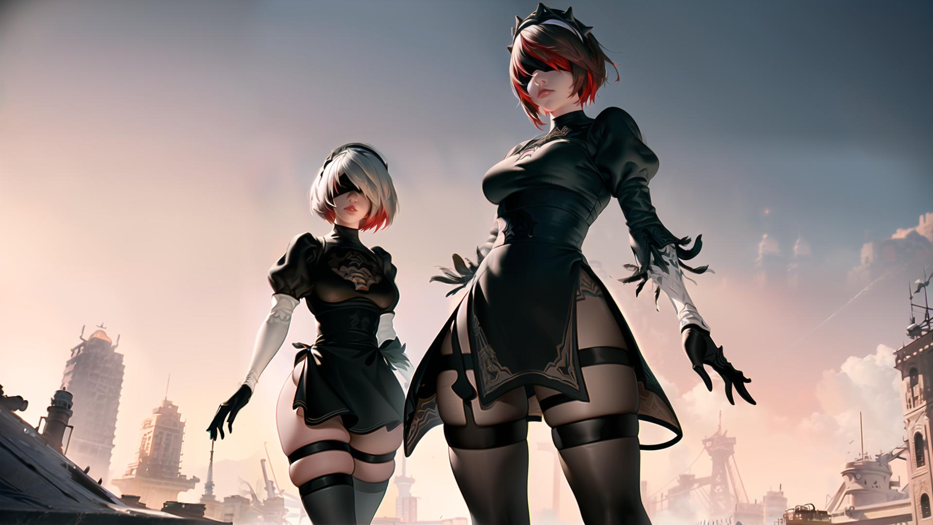 Prompt (highly detailed:1.5), ),octane render, (apocalyptic art,nier automata videogame art:1.3), (YoRHa No.2 Type B outfit:1.2), dark sky, dramatic, epic, <lora:rosaria0.85dim32:1.1>, (rosariarnd:1.4), (tiara, headdress,red hair:1.2), looking at viewer, full body, heroic pose