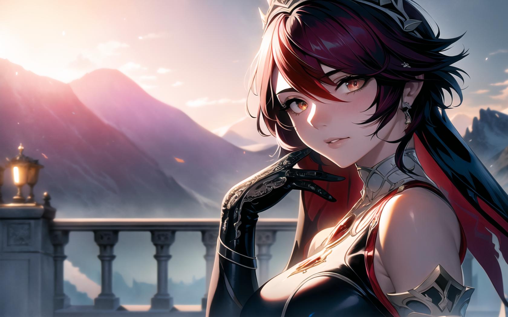| Prompt | (dramatic),(highly detailed:1.5), (realistic:1.05),(romantic),(heroic), <lora:beautiful-eyes:0.6>, (epic:1, perfect artwork), best quality,sharp focus,(8k), (4k),(Masterpiece), (Best Quality), fantasy, extremely detailed, intricate, hyper detailed, (perfect face), illustration,soft lighting, Ultra detailed fantasy environment, clearly worked out detail, intricate, cinematic,(depth of field), (moody lighting, dramatic lighting:1.2), <lora:rosaria0.85dim32:1>, rosariadef, short hair, blue sky,day, medieval background background, mountains, stairs, smile, blush, upper body, |