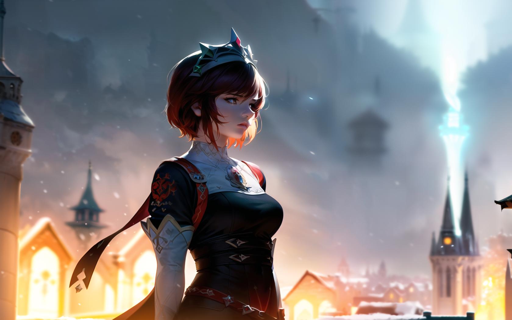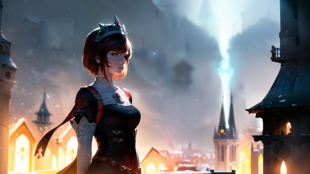 Prompt (highly detailed:1.5), (realistic:1.5),octane render,(1girl:1.4), (epic, fantasy, dramatic, romantic:1.8), best quality,dynamic pose,sharp focus,(8k), (4k),(Masterpiece), (Best Quality), fantasy, extremely detailed, intricate, hyper detailed, (perfect face), illustration,soft lighting, (sadness, loneliness, melancholy,fantasy art:1.5), (perfect artwork), best quality,sharp focus,(8k), (4k),(Masterpiece), (Best Quality), fantasy, extremely detailed, intricate, hyper detailed, (perfect face), illustration,soft lighting, clearly worked out detail, intricate, cinematic,(depth of field), (moody lighting, dramatic lighting:1.5), <lora:rosaria0.85dim32:1>, rosariadef, red short hair,long headdress. tiara, (white gloves), snowy forest background, night, moon, outdoors, galaxy in the sky, aurora borealis, snow, ((standing on the roof of the bell tower of a medieval catheral:1.3)), medieval town below, exhausted, pensive, upper body,