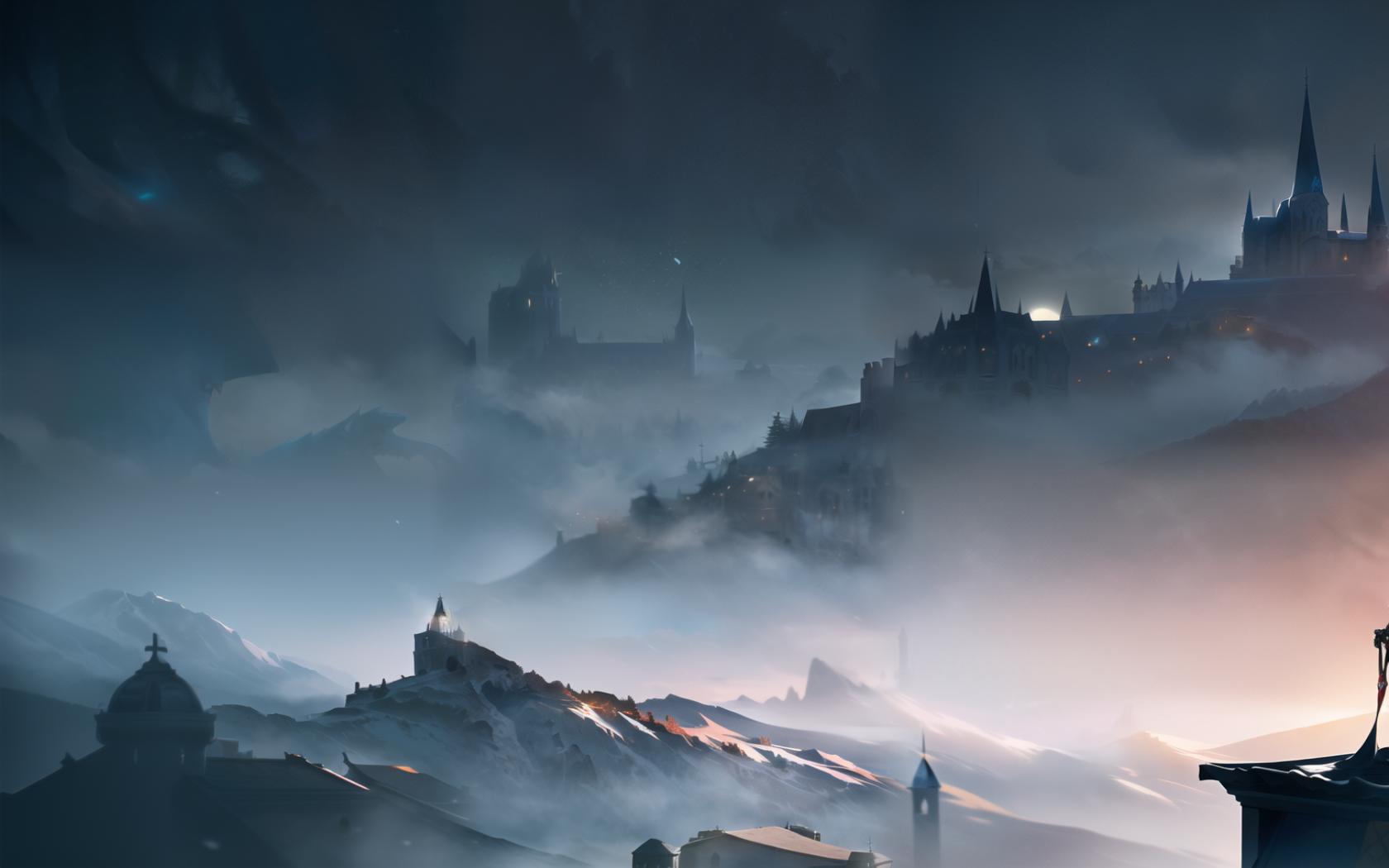 the two people are in the tower, watching something from it's balcony at night time on a cloud and fogy hillside background with a church