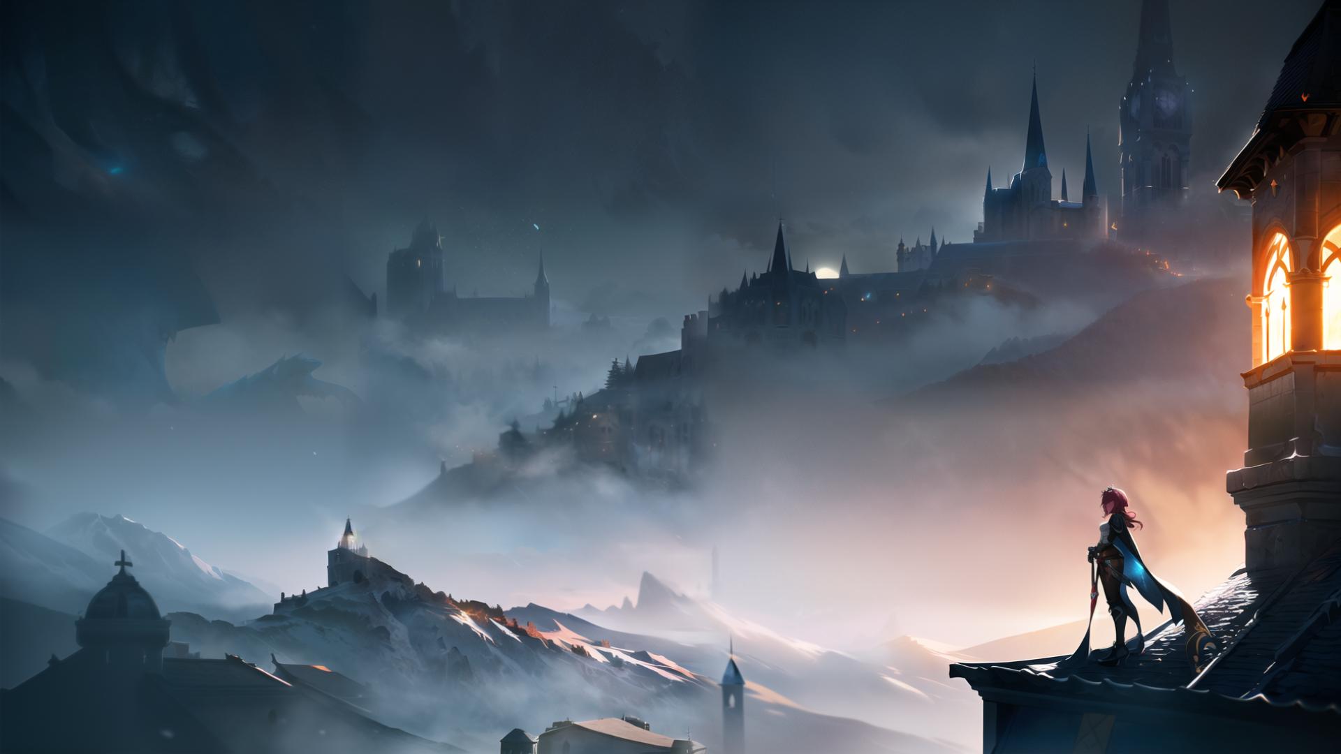 Prompt (highly detailed:1.5), (realistic:0.9),octane render,(1girl:1.4), (epic, fantasy, dramatic, romantic:1.8), best quality,dynamic pose,sharp focus,(8k), (4k),(Masterpiece), (Best Quality), fantasy, extremely detailed, intricate, hyper detailed, (perfect face), illustration,soft lighting, (sadness, loneliness, melancholy,fantasy art:1.5), (perfect artwork), best quality,sharp focus,(8k), (4k),(Masterpiece), (Best Quality), fantasy, extremely detailed, intricate, hyper detailed, (perfect face), illustration,soft lighting, clearly worked out detail, intricate, cinematic,(depth of field), (moody lighting, dramatic lighting:1.5), <lora:rosaria0.85dim32:1>, rosariadef, red short hair,long headdress. tiara, (white gloves), snowy forest background, night, moon, outdoors, galaxy in the sky, aurora borealis, snow, ((standing on the roof of the bell tower of a medieval catheral:1.3)), medieval town below, top of the world, exhausted, pensive, upper body,