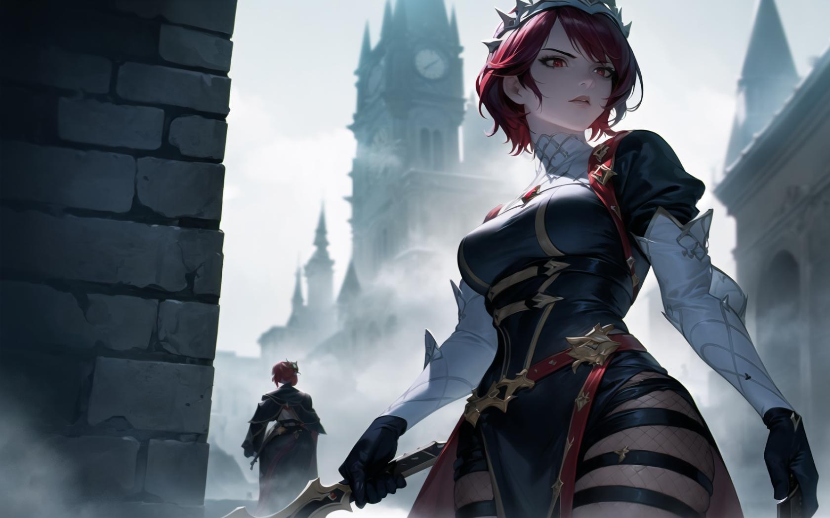 Prompt (highly detailed:1.5), (realistic:1.1),photorealistic, octane render,(skindentation:1.3),(1girl:1.4), best quality,dynamic pose,sharp focus,(8k), (4k),(Masterpiece), (Best Quality), fantasy, extremely detailed, intricate, hyper detailed, (perfect face), illustration,soft lighting, (horror,dark fantasy art:1.3), (perfect artwork), best quality,sharp focus,(8k), (4k),(Masterpiece), (Best Quality), fantasy, extremely detailed, intricate, hyper detailed, (perfect face), illustration,soft lighting, clearly worked out detail, intricate, cinematic,(depth of field), (moody lighting, dramatic lighting:1.5), <lora:rosaria0.85dim32:1>, rosariadef, red short hair,long headdress. tiara, (white gloves), night, moon, ((mist)), (rich medieval fantasy town background), (((spying a thug in the street,looking at thief. holding weapon))), partially hidden by mist, (standing shadowy upright behind a wall), angry, focused,