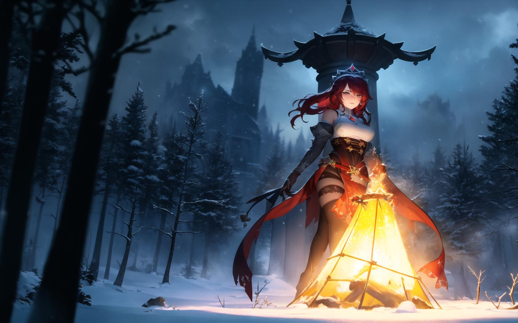 Prompt (highly detailed:1.5), (realistic:1),octane render,(1girl:1.4), best quality,dynamic pose,sharp focus,(8k), (4k),(Masterpiece), (Best Quality), fantasy, extremely detailed, intricate, hyper detailed, (perfect face), illustration,soft lighting, (sadness, loneliness, melancholy,fantasy art:1.3), (perfect artwork), best quality,sharp focus,(8k), (4k),(Masterpiece), (Best Quality), fantasy, extremely detailed, intricate, hyper detailed, (perfect face), illustration,soft lighting, clearly worked out detail, intricate, cinematic,(depth of field), (moody lighting, dramatic lighting:1.5), <lora:rosaria0.85dim32:1>, rosariadef, red short hair,long headdress. tiara, (white gloves), snowy forest background, night, moon, outdoors, galaxy in the sky, aurora borealis, snow, (leaned against a snowy tree:1.3), next to a frozen pond, (((firecamp))), exhausted, pensive,a little sad, full body,