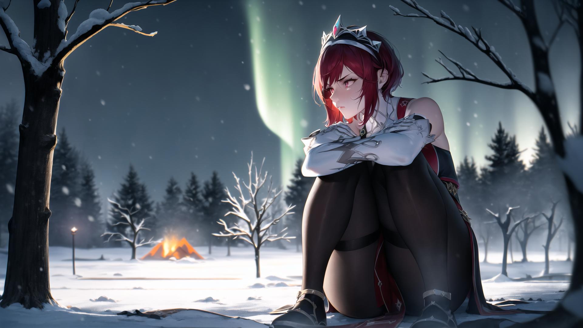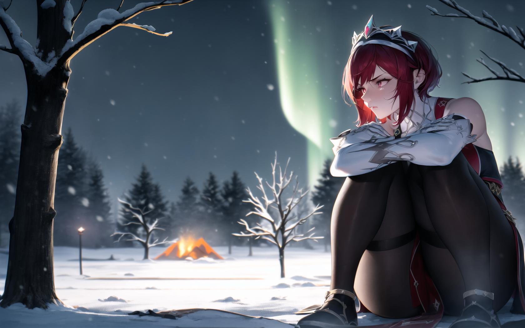 Prompt (highly detailed:1.5), (realistic:1),octane render,(1girl:1.4), best quality,dynamic pose,sharp focus,(8k), (4k),(Masterpiece), (Best Quality), fantasy, extremely detailed, intricate, hyper detailed, (perfect face), illustration,soft lighting, (sadness, loneliness, melancholy,fantasy art:1.5), (perfect artwork), best quality,sharp focus,(8k), (4k),(Masterpiece), (Best Quality), fantasy, extremely detailed, intricate, hyper detailed, (perfect face), illustration,soft lighting, clearly worked out detail, intricate, cinematic,(depth of field), (moody lighting, dramatic lighting:1.5), <lora:rosaria0.85dim32:1>, rosariadef, red short hair,long headdress. tiara, (white gloves), snowy forest background, night, moon, outdoors, galaxy in the sky, aurora borealis, snow, ((leaned against a snowy tree:1.3)), next to a frozen pond, (((firecamp))), exhausted, pensive,a little sad, full body,