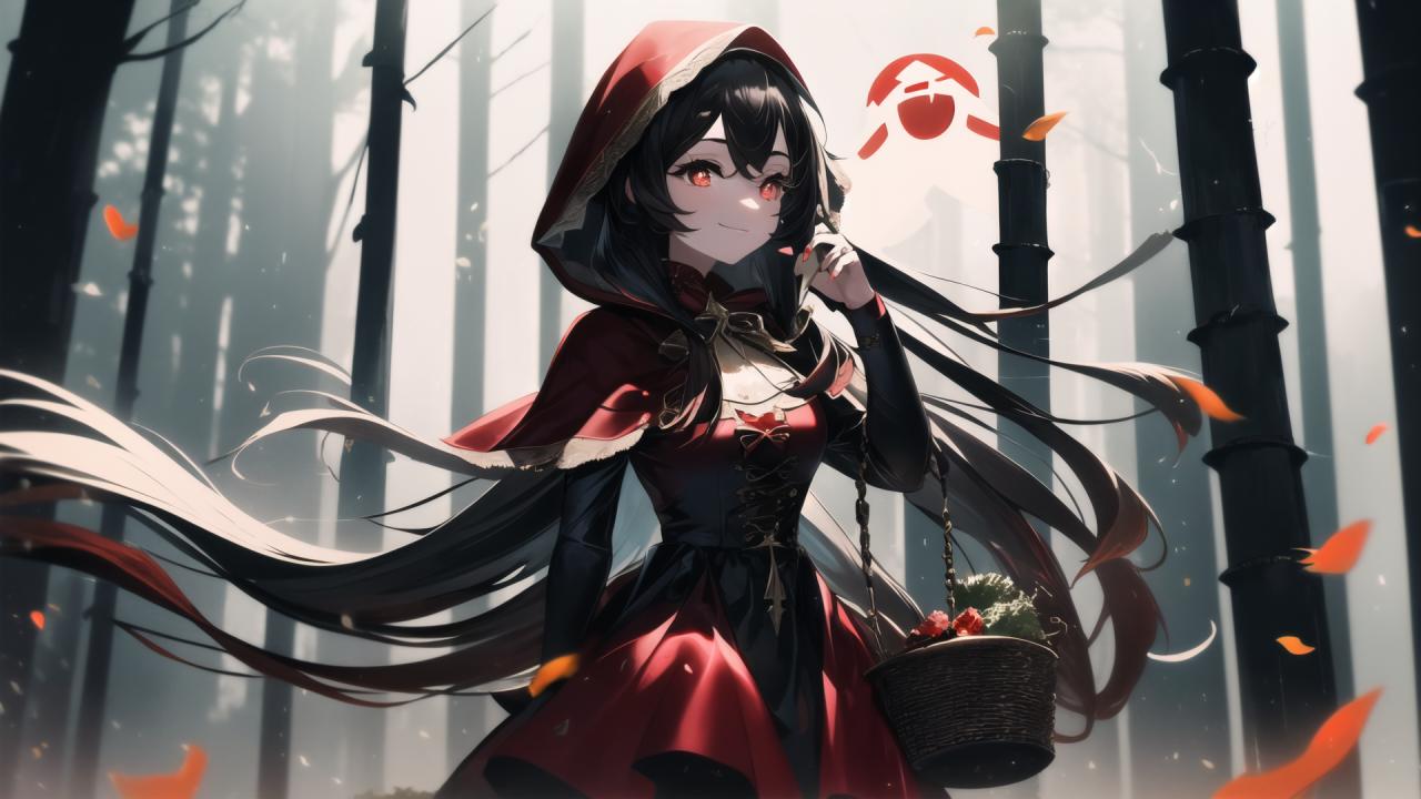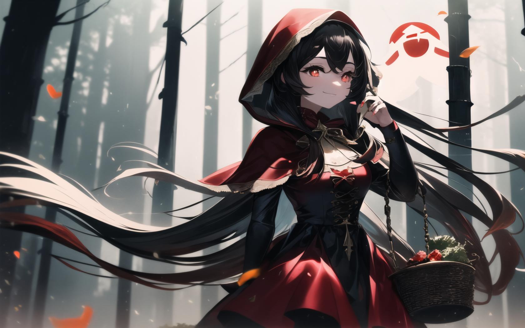 | Prompt | (dramatic:1.1),(highly detailed:1.5), (realistic:1.05),(digital art:1.9),(romantic:1.4),,(heroic:1.1), <lora:beautiful-eyes:0.8>, (epic:1.2, perfect artwork), best quality,sharp focus,(8k), (4k),(Masterpiece), (Best Quality), fantasy, extremely detailed, intricate, hyper detailed, (perfect face), illustration,soft lighting, Ultra detailed fantasy environment, clearly worked out detail, intricate, cinematic,(depth of field), ( dramatic lighting:1.2), <lora:hutao1:1>,hutaornd,1girl, solo,very long hair, forest at fall background, day, fall, autumn, (dressed as little red riding hood:1.3), holding wicker basket full of of cookies, holding a jar of milk, eating a cookie, walking in forest, medieval little house in the woods far away, ((next to black wolf:1.1)), ghost hidden behing a tree, happy, smile, surprised, |