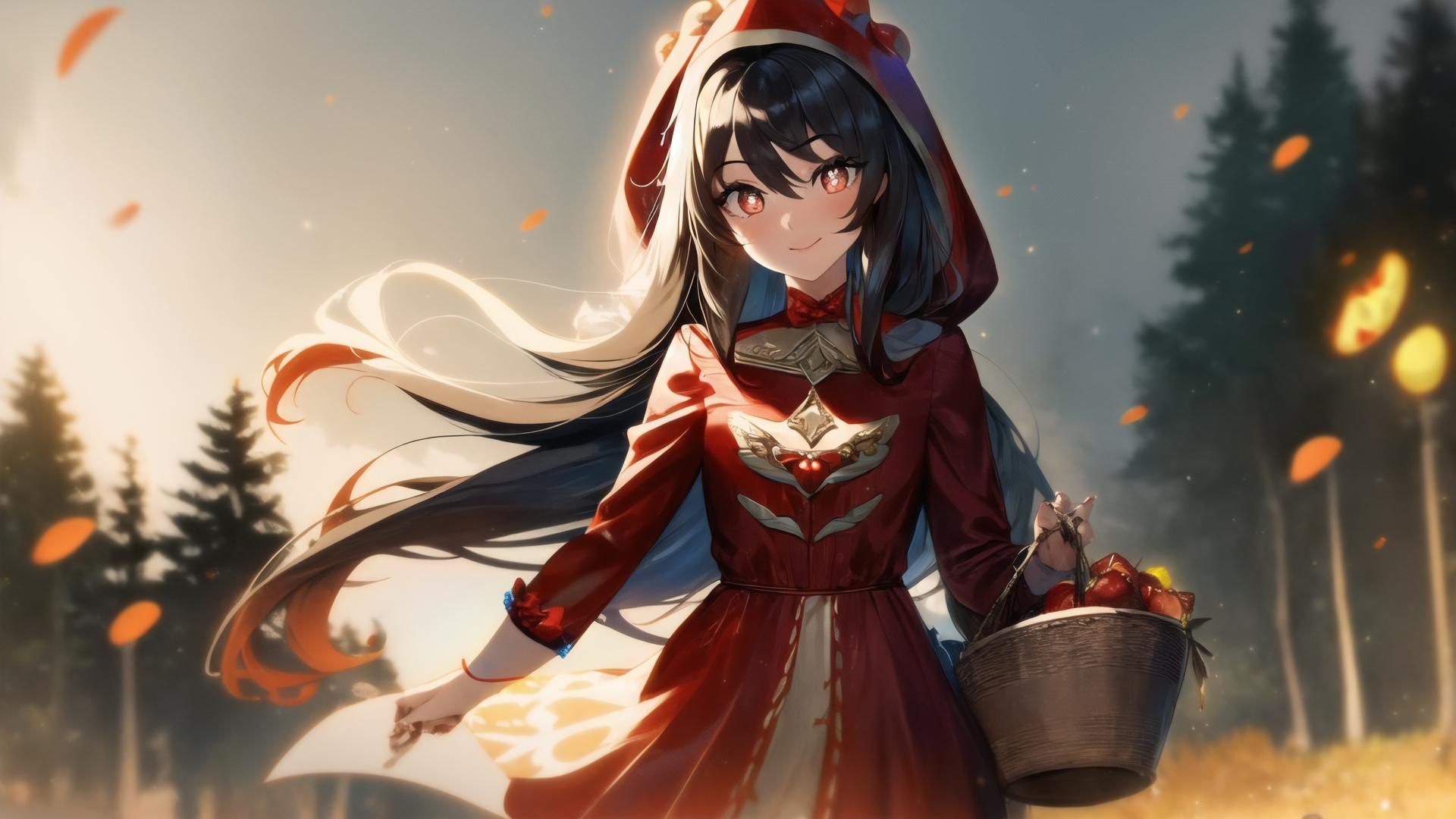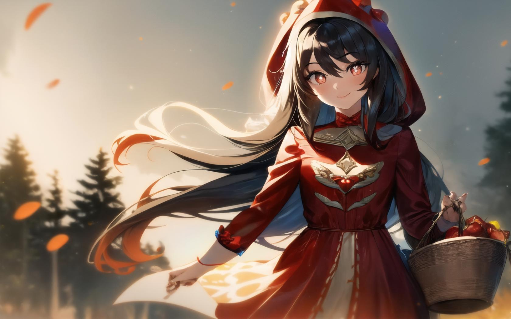 | Prompt | (pixar style :1.8), <lora:beautiful-eyes:0.8>, (epic:1.2, perfect artwork), best quality,sharp focus,(8k), (4k),(Masterpiece), (Best Quality), fantasy, extremely detailed, intricate, hyper detailed, (perfect face), illustration,soft lighting, Ultra detailed fantasy environment, clearly worked out detail, intricate, cinematic,(depth of field), ( dramatic lighting:1.2), <lora:hutao1:1>,hutaornd,1girl, solo,very long hair,brown hair, forest at fall background, day, fall, autumn, (dressed as little red riding hood:1.3), (red hood, red leather boots), holding wicker basket full of of cookies, walking in forest, medieval little house in the woods far away, ((next to black wolf:1.1)), ghost hidden behing a tree, happy, smile, surprised, |