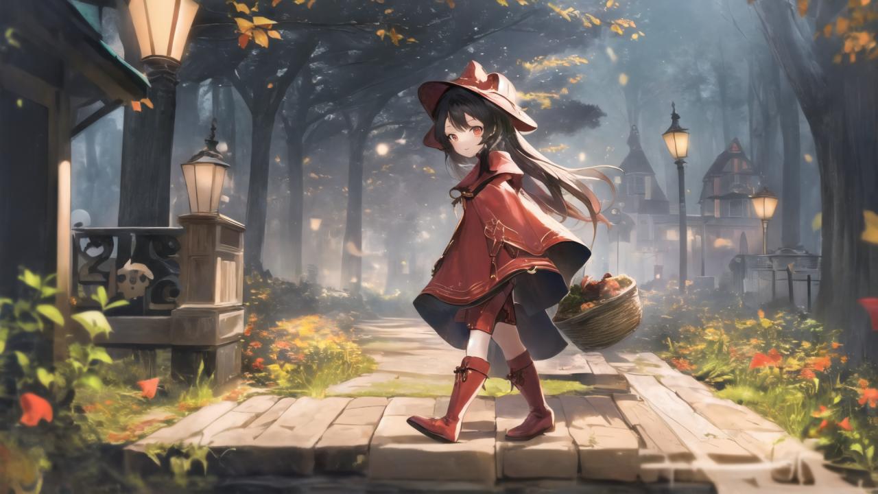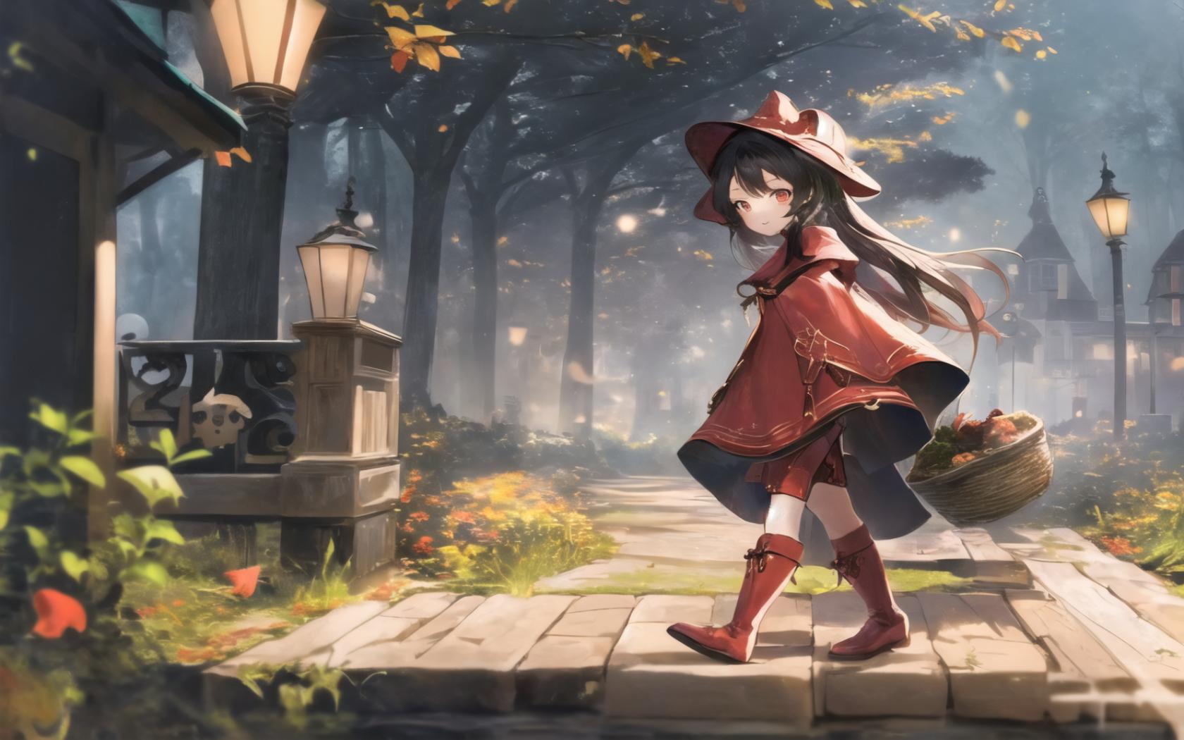 | Prompt | (style of children's fable book illustration of the 19th century:1.9), (child:1.8), <lora:beautiful-eyes:0.8>, (epic:1.2, perfect artwork), best quality,sharp focus,(8k), (4k),(Masterpiece), (Best Quality), fantasy, extremely detailed, intricate, hyper detailed, (perfect face), illustration,soft lighting, Ultra detailed fantasy environment, clearly worked out detail, intricate, cinematic,(depth of field), ( dramatic lighting:1.2), <lora:hutao1:1>,hutaornd,(1girl, solo:1.6),very long hair,brown hair, forest at fall background, day, fall, autumn, (dressed as little red riding hood:1.3), (red hood, red leather boots:1.4), ((holding wicker basket full of of cookies)), walking in forest, medieval little house in the woods far away, ghost hidden behing a tree, happy, smile, surprised, |