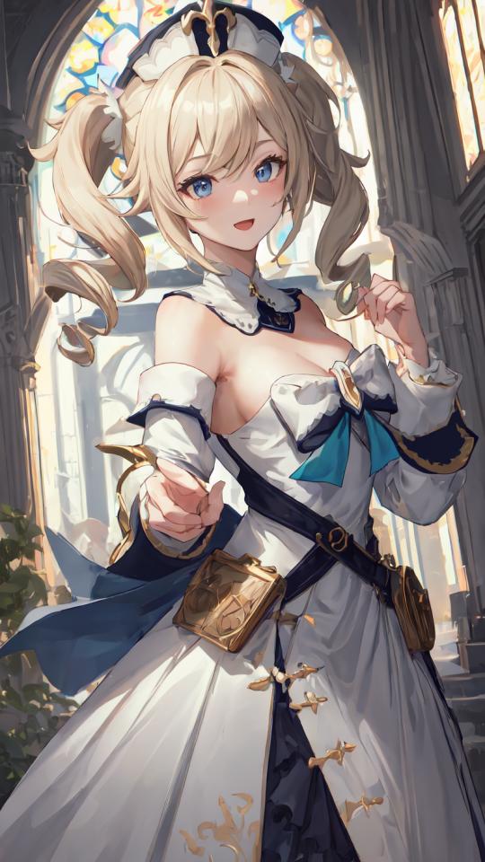 Prompt <lora:barbara1:1>barbaradef, dancing,singing, happy, shy, front of medieval cathedral, stained glass, open place, spring, trees,courtyard,