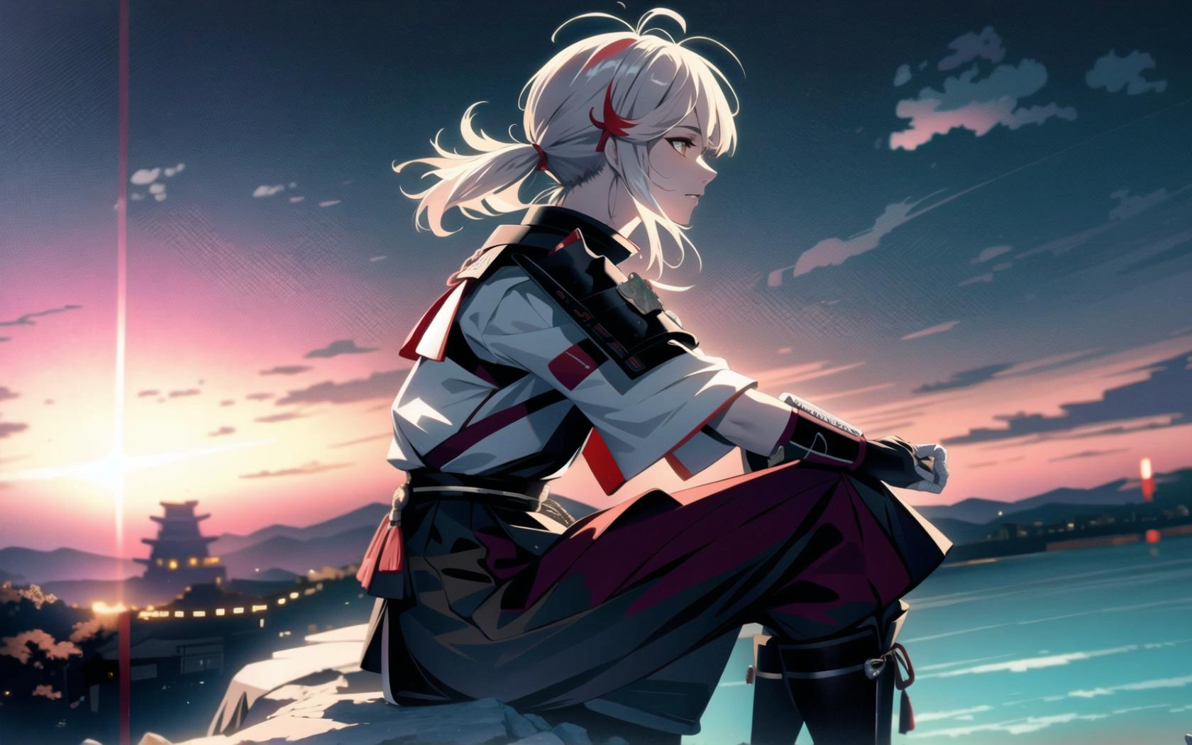 Prompt (dramatic:1.2),(highly detailed:1.5), (realistic:1.05),(digital art:1.9),(romantic:1.6),(heroic:1.0), <lora:beautiful-eyes:0.7>, (epic:1.2, perfect artwork), best quality,sharp focus,(8k), (4k),(Masterpiece), (Best Quality), fantasy, extremely detailed, intricate, hyper detailed, (perfect face), illustration,soft lighting, Ultra detailed fantasy environment, clearly worked out detail, intricate, cinematic,(depth of field:0.9), ( dramatic lighting:1.2), <lora:kazuha2:1>,1boy, solo,male focus,eyes focus,(muscular), outdoors, (sunset),autumn, fall, trees, maple leafs in the wind,sakura trees,wind, (forest at fall background), (sitting cross-legged top of a tall cliff:1.3), top of the world, (medieval japanese town below:1.6), serious, focused, (meditating:1.5), (full body, sideview:1.3),
