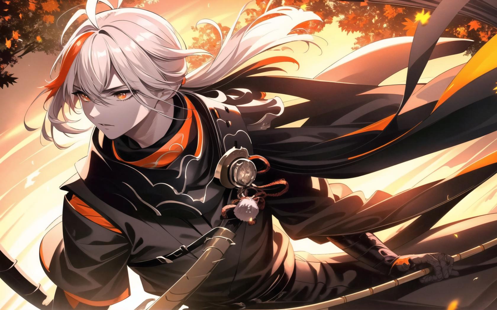 | Prompt | (black and orange theme:1.5), (dramatic:1.2),(highly detailed:1.5), (realistic:1.35),(digital art:1.7), (romantic, heroic:1.6), <lora:beautiful-eyes:0.7>, (epic:1.4, perfect artwork), best quality,sharp focus,(8k), (4k),(Masterpiece), (Best Quality), fantasy, extremely detailed, intricate, hyper detailed, (perfect face), illustration,soft lighting, Ultra detailed fantasy environment, clearly worked out detail, intricate, cinematic,(depth of field), ( dramatic lighting:1.2), <lora:kazuha2:0.9>,male focus,eyes focus,(muscular), (japanese samurai straw hat:1.3), (outdoors, (sunset),autumn, fall, trees, sakura trees,wind), (maple leafs in the wind:1.2)., (forest at fall background:1.4), (front of a medieval japanese temple:1.2), (slowly walking:1.3), (playing bamboo flute:1.6), serious, (angry),dark, |