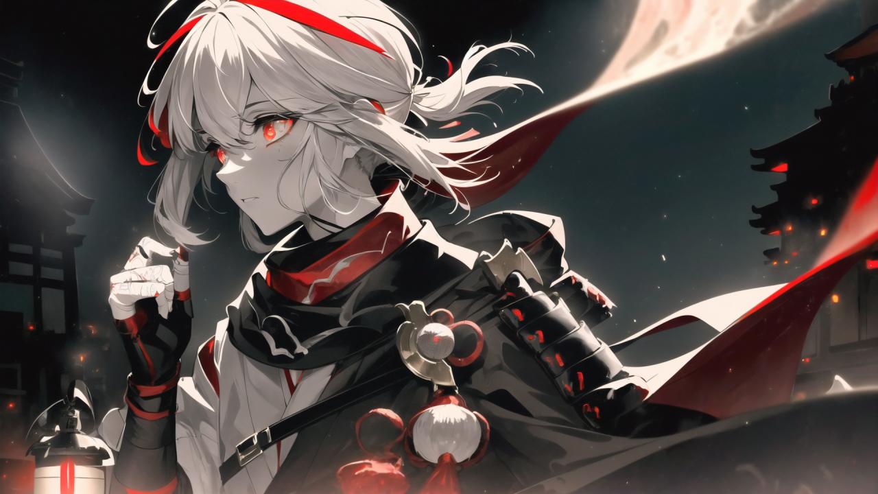 1boy, antenna hair, architecture, armor, bandaged hand , bandages, bangs, black gloves, black scarf, crossed bangs, east asian architecture, fingerless gloves, gloves, glowing, hair between eyes, japanese armor, japanese clothes, lantern, male focus, moon, multicolored hair, night, outdoors, parted lips, ponytail, red eyes, red hair, scarf, shoulder armor, sky, solo, streaked hair, tassel, upper body, white hair