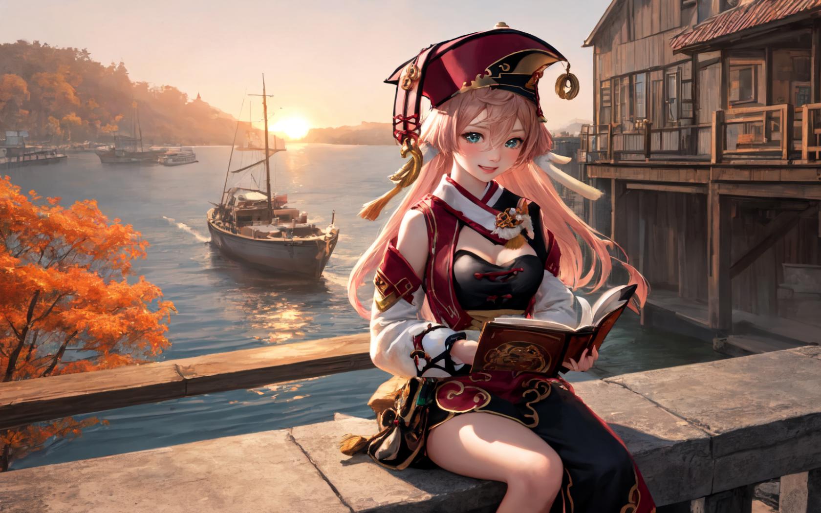 1girl, :d, antlers, architecture, bangs, bare shoulders, blue eyes, blush, boat , book, bridge, building, cleavage, cleavage cutout, clothing cutout, crop top, day, detached sleeves, east asian architecture, feet out of frame, green eyes, hair between eyes, hat, holding, holding book, horns, long hair, long sleeves, looking at viewer, medium breasts, open book, open mouth, outdoors, pink hair, puffy long sleeves, reading, red headwear, scenery, ship, sidelocks, sitting, sky, smile, solo, sunlight, tree, water, watercraft, white sleeves