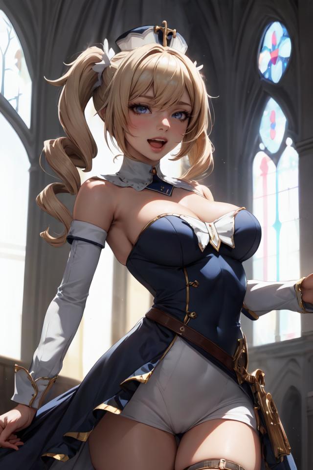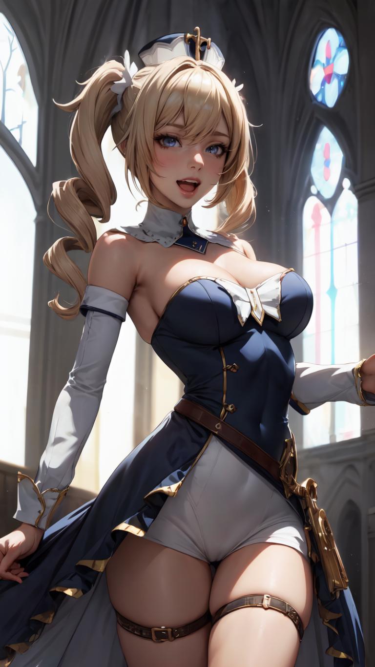 1girl, :d, bangs, bare shoulders, belt, blonde hair, blue eyes, blush, cameltoe, church , cleavage, covered navel, cowboy shot, detached collar, detached sleeves, dress, drill hair, hat, indoors, large breasts, long hair, long sleeves, looking at viewer, medium breasts, open mouth, shorts, skindentation, smile, solo, strapless, thigh gap, thigh strap, twin drills, twintails, white headwear, white shorts, window