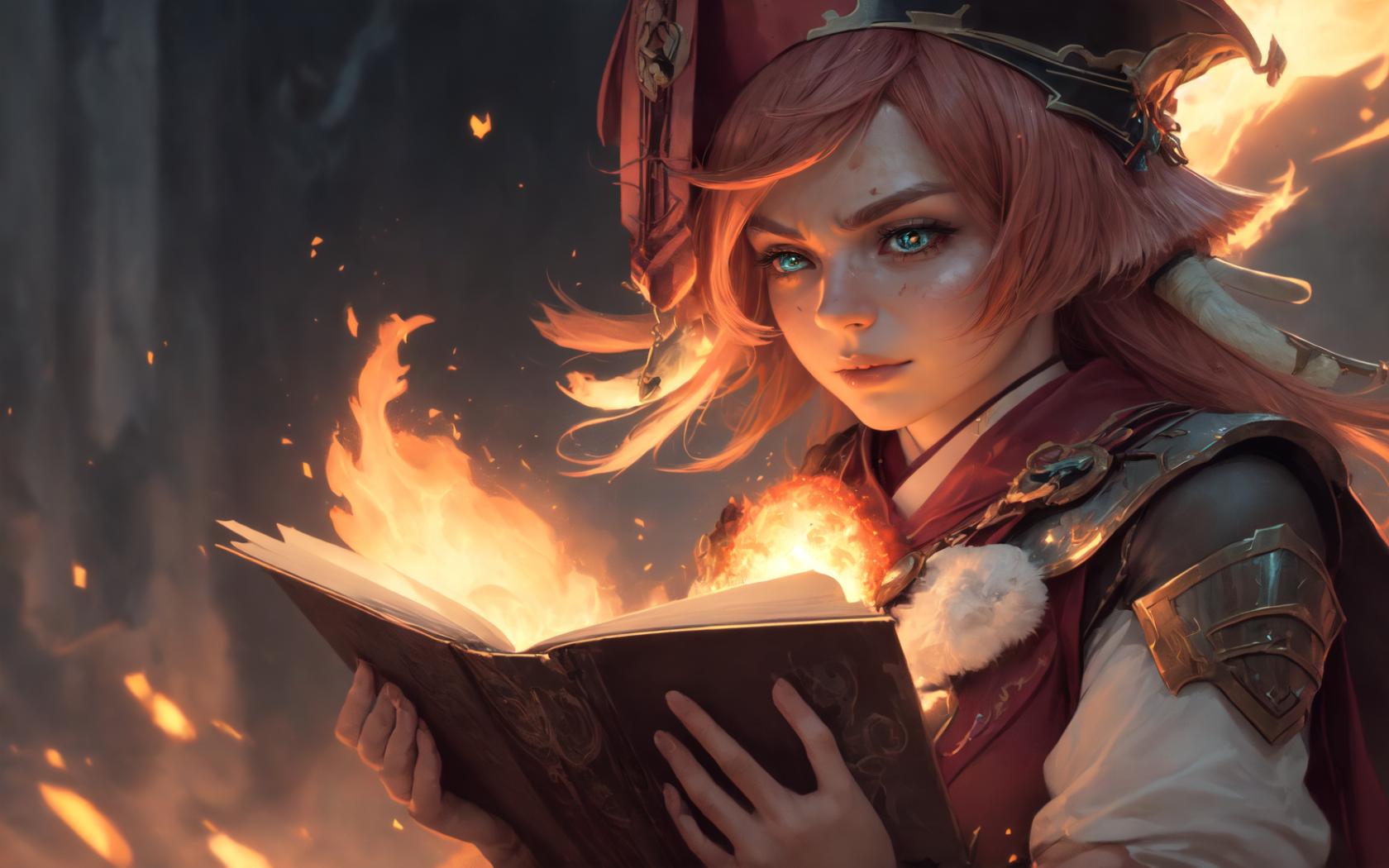 a beautiful young woman holding an open book in front of burning flames, with flames coming out of the pages behind her and she is wearing a red