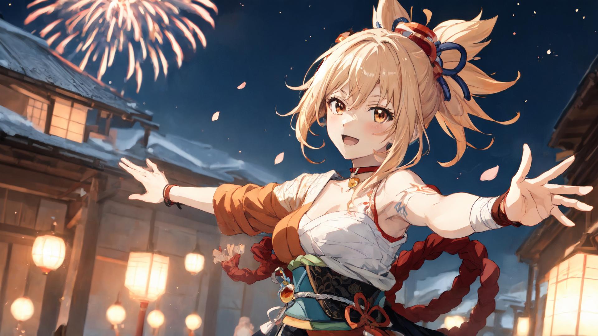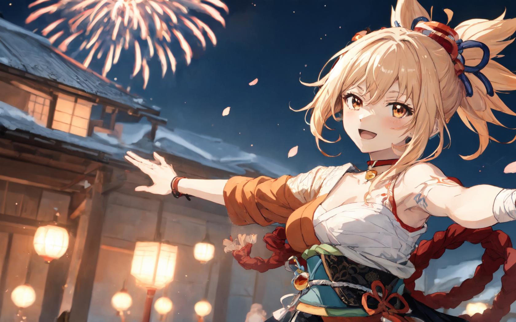 1girl, :d, architecture, arm tattoo, armpits, bandaged arm, bandages, bangs, blonde hair, blush, bracelet, chest sarashi, chest tattoo, choker, cleavage, east asian architecture, fireworks, hadanugi dousa, hair ornament, japanese clothes, jewelry, kimono, lantern, looking at viewer, medium breasts, night, night sky, obi, open mouth, orange eyes, orange kimono , outdoors, outstretched arms, ponytail, red choker, rope, sarashi, sash, shimenawa, single bare shoulder, sky, smile, solo, spread arms, tattoo, upper body, vision (genshin impact), yellow eyes