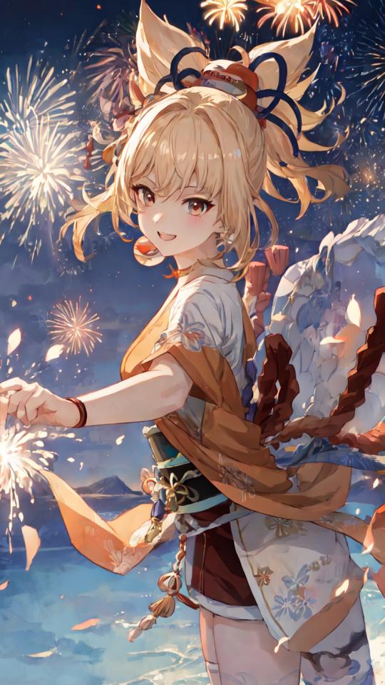 1girl, :d, bandages, bangs, blonde hair, blush, choker, cowboy shot, earrings, fireworks, hair ornament, japanese clothes, jewelry, kimono, looking at viewer, night, night sky, obi, open mouth, orange eyes, orange kimono, outdoors, ponytail, rope, sarashi, sash, shimenawa, sky, smile, solo, sparkler , thighhighs, vision (genshin impact)