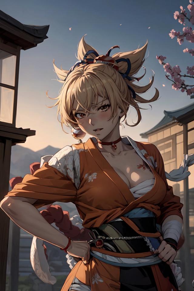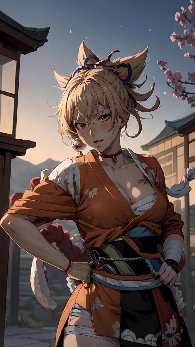 1girl, architecture, arm tattoo, bandaged arm, bandaged leg, bandages, bangs, blonde hair, blush, breast tattoo, cherry blossoms, chest tattoo, choker, cleavage, collarbone, cowboy shot, east asian architecture, fingerless gloves, flower tattoo , gloves, hadanugi dousa, hair between eyes, hair ornament, hands on hips, japanese clothes, kimono, large breasts, looking at viewer, medium breasts, obi, open mouth, orange kimono, outdoors, parted lips, ponytail, red choker, rope, sarashi, sash, shimenawa, single bare shoulder, sky, solo, tattoo, vision (genshin impact), yellow eyes