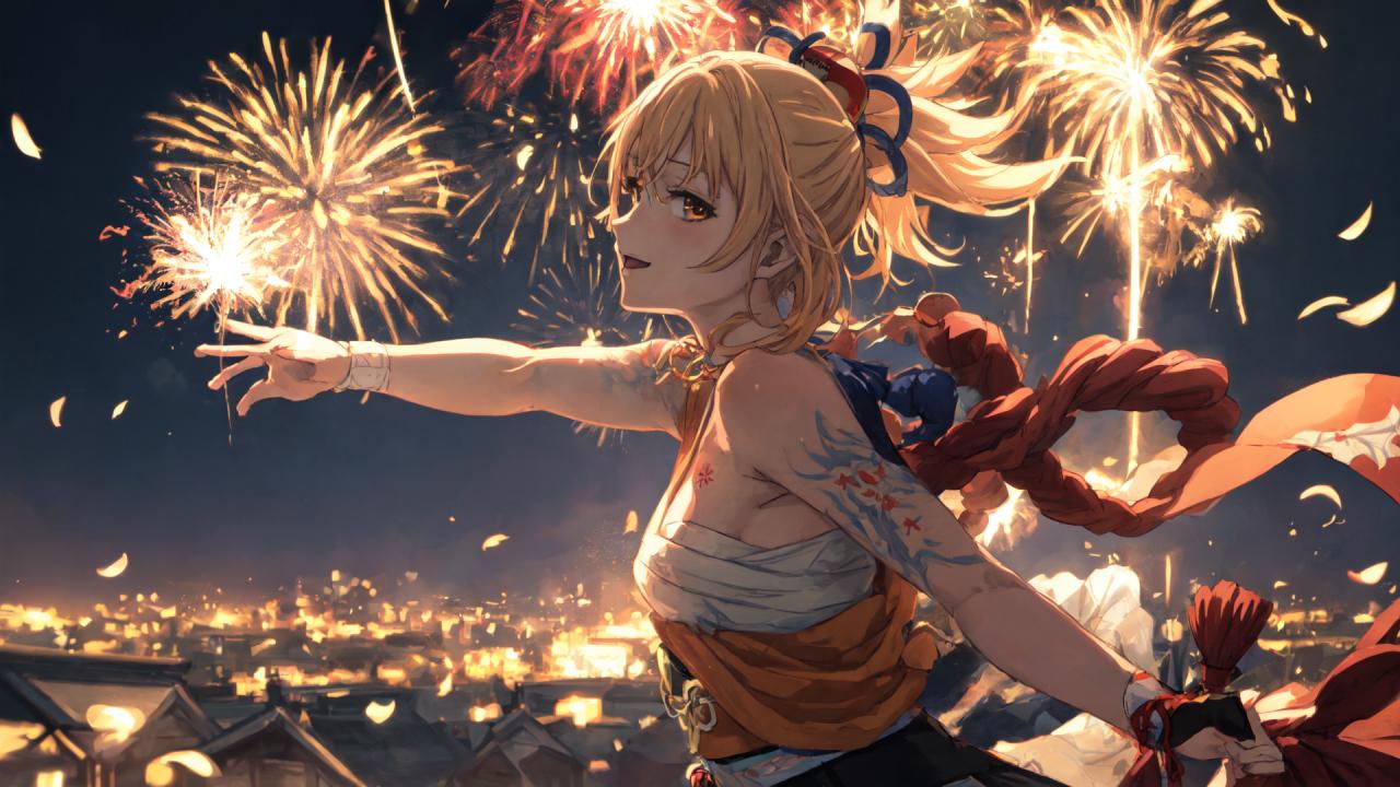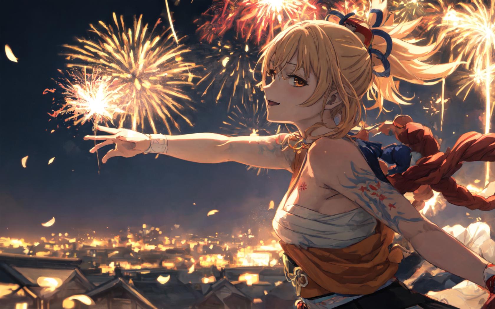 1girl, aerial fireworks, arm tattoo, armpits, bandaged arm, bandages, bangs, bare shoulders, blonde hair, blush, chest sarashi, chest tattoo, choker, fireworks, from side, gloves, hadanugi dousa, hair ornament, holding, japanese clothes, kimono, looking at viewer, medium breasts, night, night sky, obi, open mouth, orange eyes, orange kimono, outdoors, petals, ponytail, rope, sarashi, sash, shimenawa, shoulder tattoo, sky, smile, solo, sparkler , tattoo, upper body, vision (genshin impact), wristband