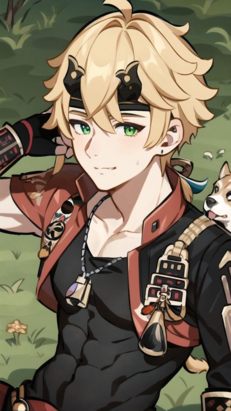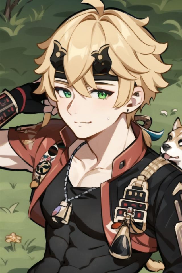 | Prompt | (perfect artwork), best quality,,(8k), (4k),(Masterpiece), (Best Quality), extremely detailed, intricate, hyper detailed, (perfect face), illustration,soft lighting, clearly worked out detail, intricate, cinematic,(depth of field), <lora:thoma:1>thoma (genshin impact), 1boy, male focus, dog tags, horned headwear, green eyes, horns, gloves, fake horns, solo,fingerless gloves, bangs, headband, hair between eyes, ((short blonde hair,muscular)), rolling in grass, playing with dog, <lora:GenshinStickers:1>chibi style:1.9, |