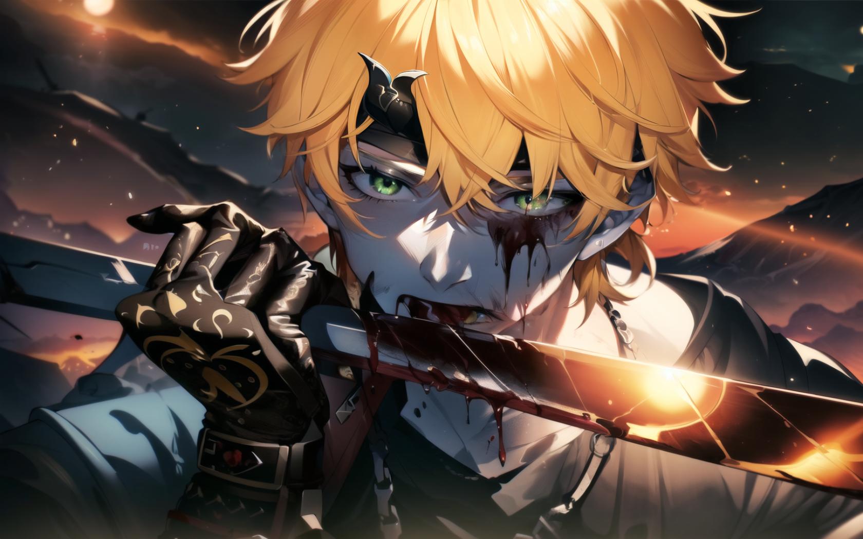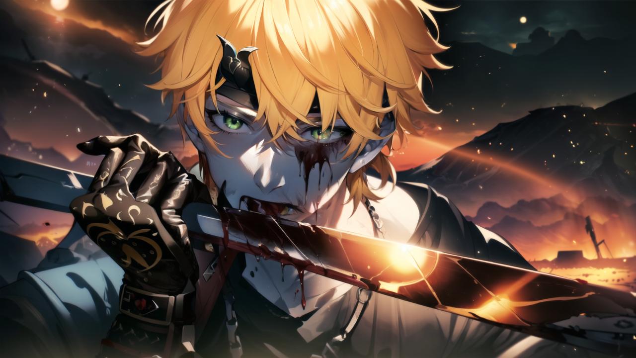 | Prompt | (epic,dark fantasy art,apocalytic art,highly detailed:1.8), (sunset, dark atmosphere:1.7),(horror:1.6), (perfect artwork), best quality,,(8k), (4k),(Masterpiece), (Best Quality), extremely detailed, intricate, hyper detailed, (perfect face), illustration,soft lighting, clearly worked out detail, intricate, cinematic,(depth of field), <lora:thoma:1>thoma (genshin impact), 1boy, male focus, dog tags, horned headwear, green eyes, horns, gloves, fake horns, solo,fingerless gloves, bangs, headband, hair between eyes, ((short blonde hair,muscular)), holding bloody blade, licking blood on the blade,blood on face, dark clouds, serious, focused, looking at viewer,angry,dangerous, |