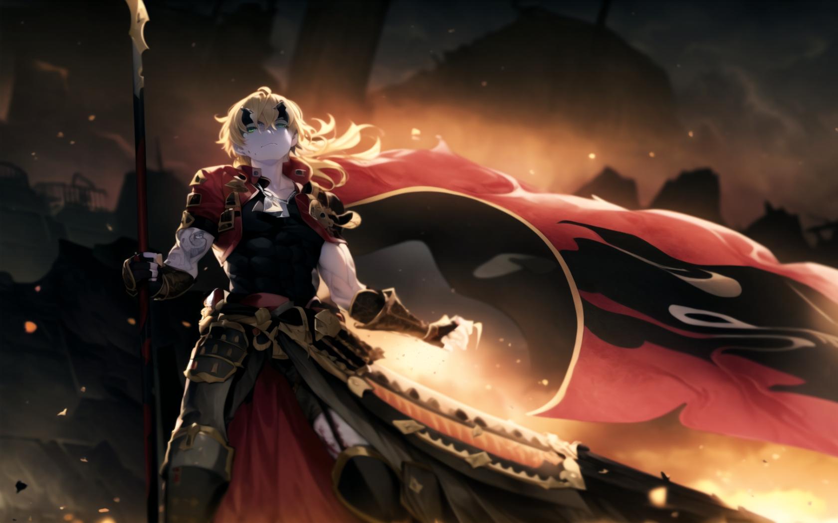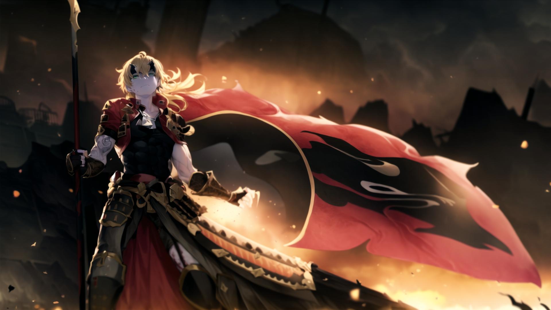 1boy, arm guards, armor, bangs, black gloves, black pants, black shirt, blonde hair, cape, closed mouth, dog tags, embers , fake horns, feet out of frame, fingerless gloves, fire, flag, floating hair, gloves, green eyes, hair between eyes, headband, holding, holding polearm, holding weapon, horned headwear, horns, japanese armor, long hair, looking at viewer, male focus, outdoors, pants, polearm, ponytail, red cape, shirt, shoulder armor, solo, spear, standing, torn clothes, vambraces, waist cape, weapon
