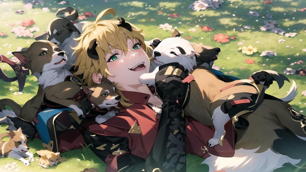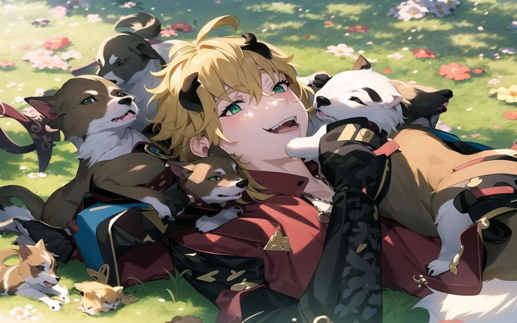 | Prompt | 1boy, animal, animal on shoulder, animalization, bangs, black cat, blonde hair, boar, bunny, cat, day, dog, field, flower, fox, grass, green eyes, hair between eyes, lion, looking at viewer, lying, male focus, on back, on grass, on stomach, open mouth, outdoors, pig, pokemon \(creature\), smile, squirrel, virtual youtuber, wolf, a woman with blonde hair and a bunch of dogs in a field of flowers and grass with a panda bear, Anne Said, official art, a detailed painting, furry art |
