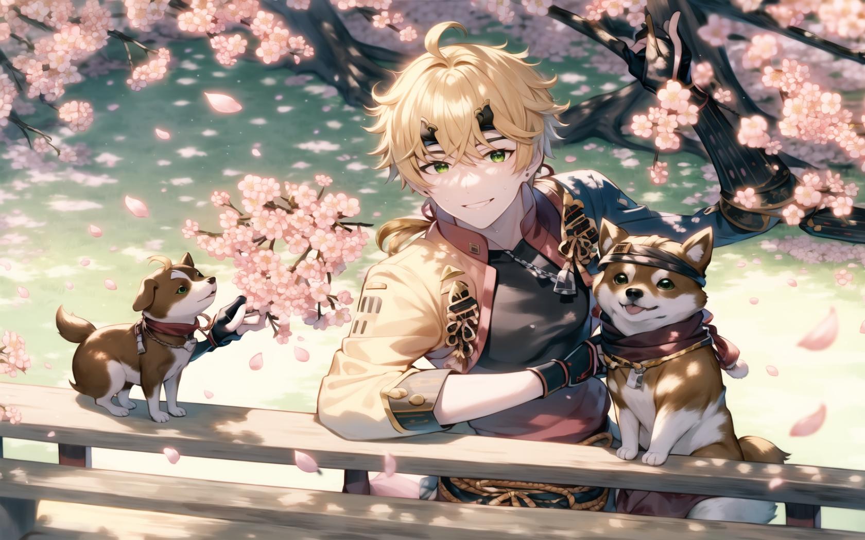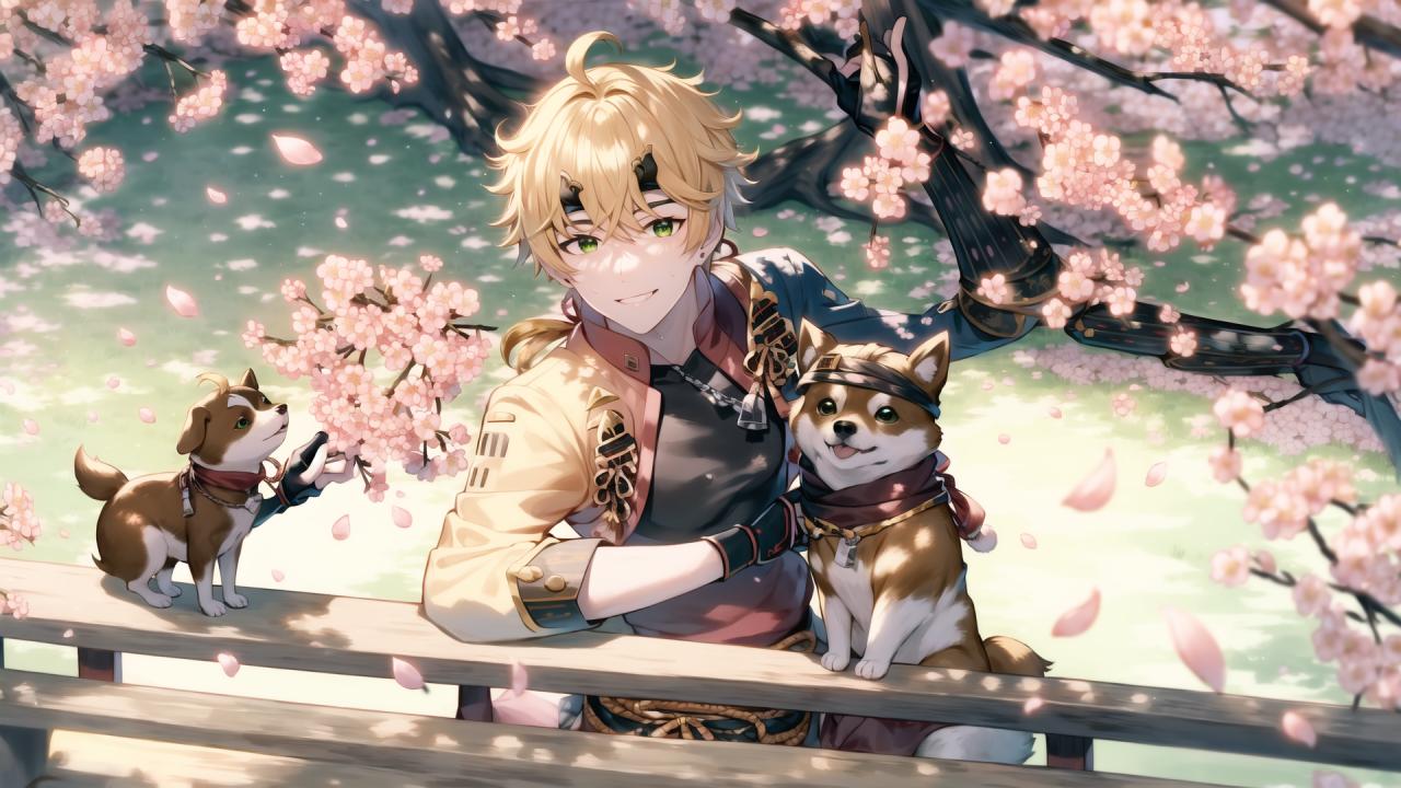 | Prompt | <lora:thoma:1.3>thoma (genshin impact), 1boy, male focus, dog tags, horned headwear, green eyes, horns, gloves, fake horns, solo,fingerless gloves, bangs, headband, hair between eyes, ((short blonde hair,muscular)), 1boy, animal, animalization, bangs, black gloves, blonde hair, blue sky, branch, bridge, dog, cherry blossoms, cup, dango, day, dog, egasumi, falling leaves, falling petals, flower, gloves, green eyes, hanami, holding animal, holding shiba, shiba inu, tree, kagamine len, leaves in wind, male focus, open window, outdoors, petals, petals on liquid, picnic, pink flower, plum blossoms, porch, rose petals, sanshoku dango, shirt, sitting, smile, sparrow, spring \(season\), tree, tube, wagashi, white flower, wind, wisteria, a woman sitting on a bench with two dogs in front of her and cherry blossoms in the background,, Ai-Mitsu, official art, a detailed painting, sots art |