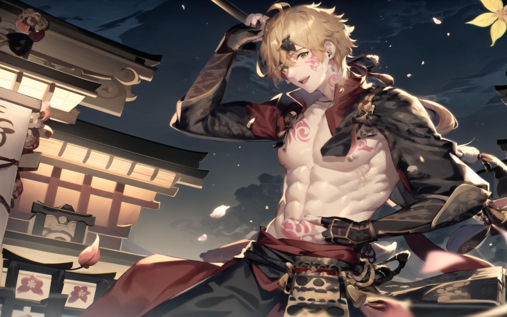 1boy, abs, ahoge, architecture, arm up, bangs, bare pectorals, black gloves, blonde hair, chest tattoo, cowboy shot, ear piercing, east asian architecture, fake horns, falling petals, fingerless gloves, flower, gloves, green eyes, hair between eyes, headband, holding, holding weapon, horned headwear , horns, jacket, lantern, long hair, long sleeves, looking at viewer, low ponytail, male focus, muscular, muscular male, night, night sky, nipples, open clothes, open mouth, outdoors, pants, paper lantern, pectorals, petals, piercing, ponytail, rope, sky, smile, solo, stomach, stomach tattoo, tassel, tattoo, toned, toned male, weapon