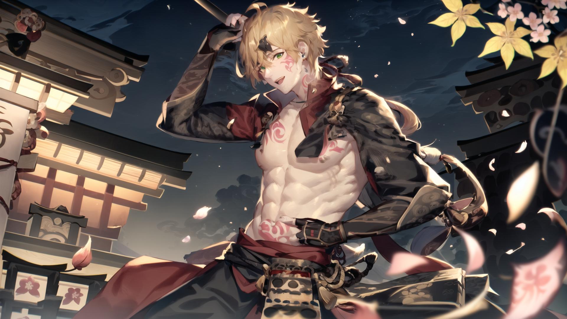 | Prompt | (highly detailed:1.5), (perfect artwork), best quality,,(8k), (4k),(Masterpiece), (Best Quality), extremely detailed, intricate, hyper detailed, (perfect face), illustration,soft lighting, clearly worked out detail, intricate, cinematic,(depth of field), <lora:thoma:1>thoma (genshin impact), 1boy, male focus, dog tags, horned headwear, green eyes, horns, gloves, fake horns, blonde hair, solo,fingerless gloves, bangs, ponytail, headband, open mouth, hair between eyes, ((muscular)), (holding polearm),((( topless, japanese tattoos:1.2))), night, sakura trees, sakura blossoms, japanese medieval mansion far away, inside a japanese zen garden, (sexy,serious,light smile,looking at viewer), |