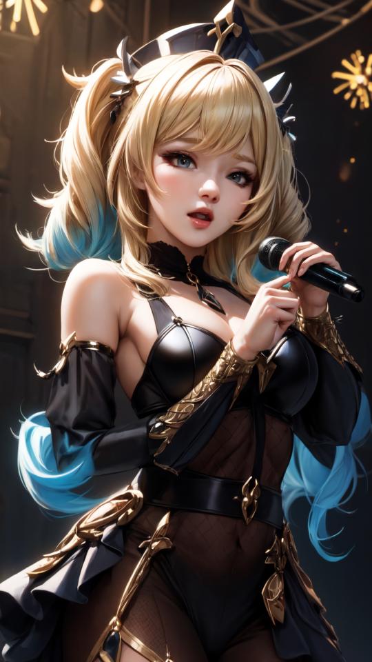 1girl, bangs, bare shoulders, belt, black dress, blonde hair, blue eyes, blue hair, cleavage, covered navel, cowboy shot, detached sleeves, dress, hair ornament, hat, holding, holding microphone , long hair, looking at viewer, medium breasts, microphone, multicolored hair, open mouth, pantyhose, parted lips, solo, twintails