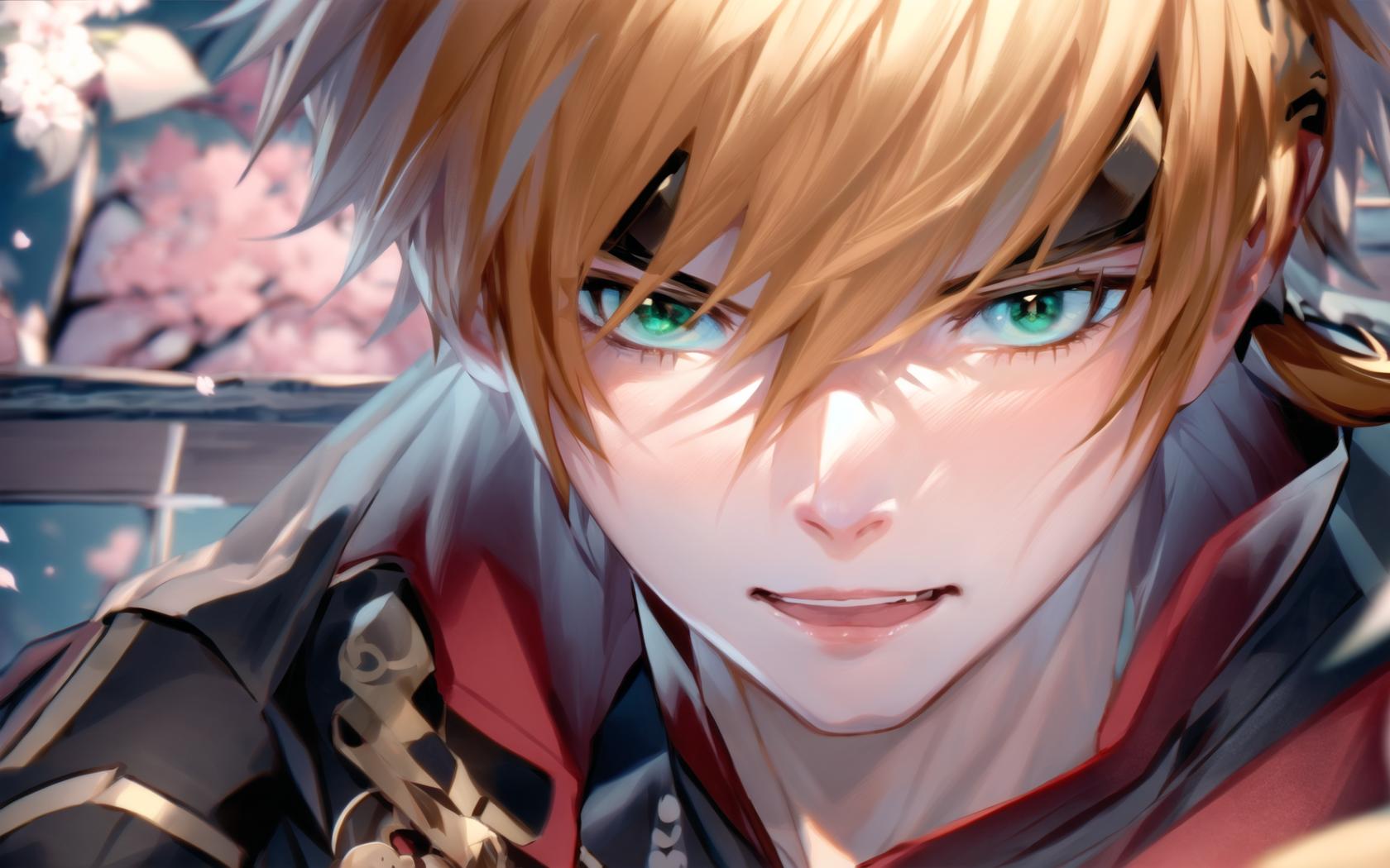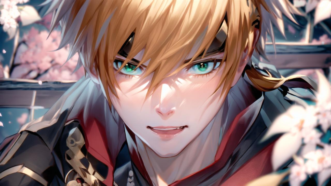 Prompt (epic,highly detailed:1.5), (perfect artwork), best quality,,(8k), (4k),(Masterpiece), (Best Quality), extremely detailed, intricate, hyper detailed, (perfect face), illustration,soft lighting, clearly worked out detail, intricate, cinematic,(depth of field), <lora:thoma:1>thoma (genshin impact), 1boy, male focus, dog tags, horned headwear, green eyes, horns, gloves, fake horns, blonde hair, solo,fingerless gloves, bangs, ponytail, headband, open mouth, hair between eyes, ((muscular)), looking at viewer, angry, sakura blossoms, sakura trees backgroudn,