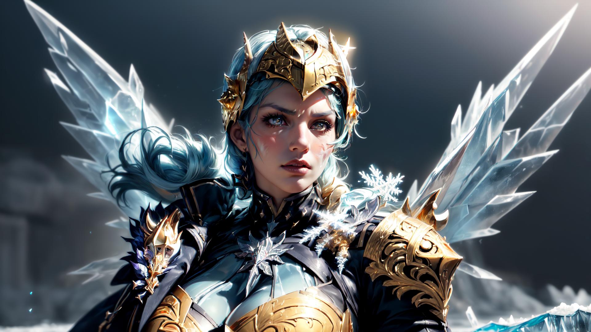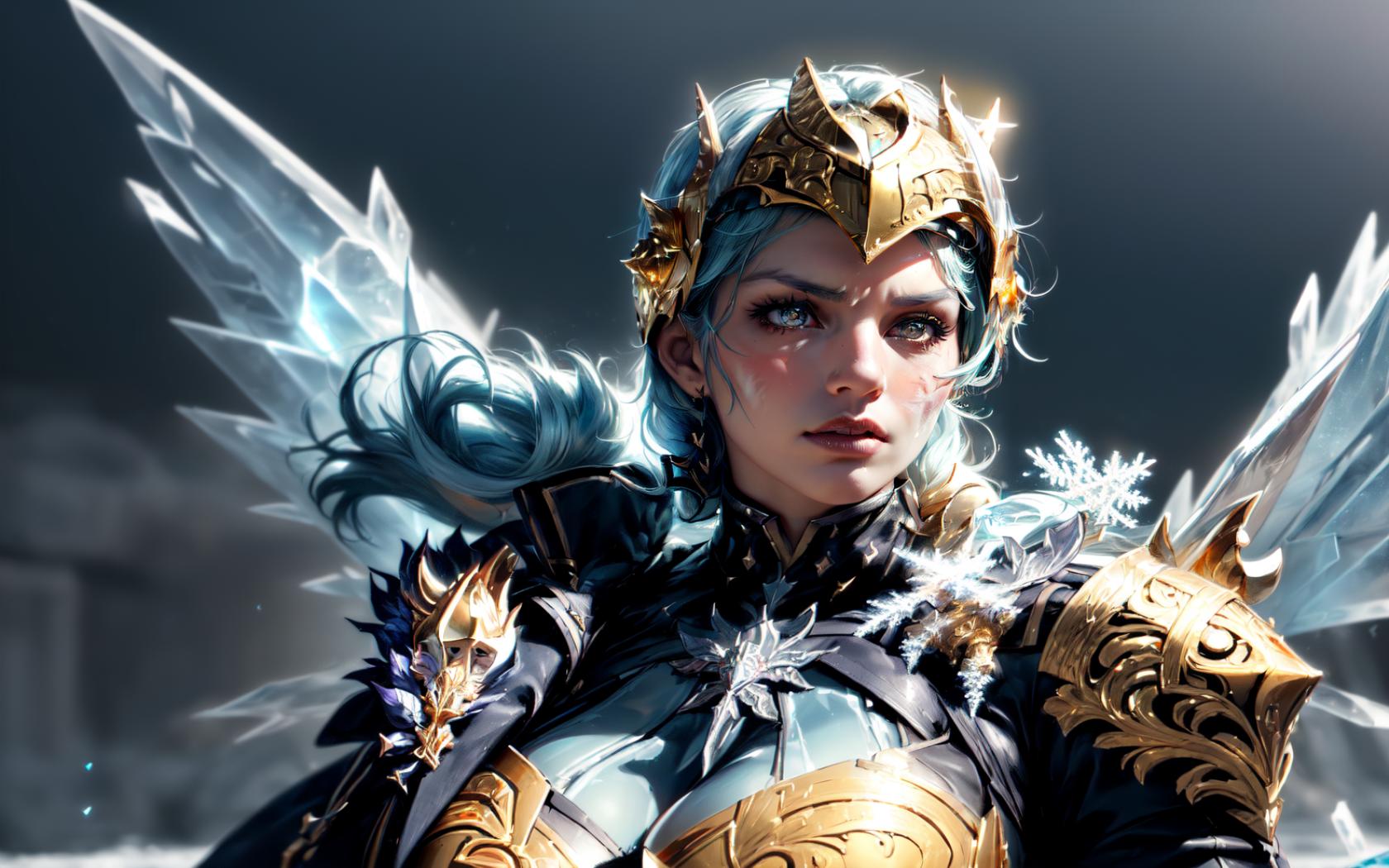 (walkyrie,glowing golden ornate shining armor,walkyrie shining golden open helmet,huge ice feathered archangel frozen wings wide open:1.9),