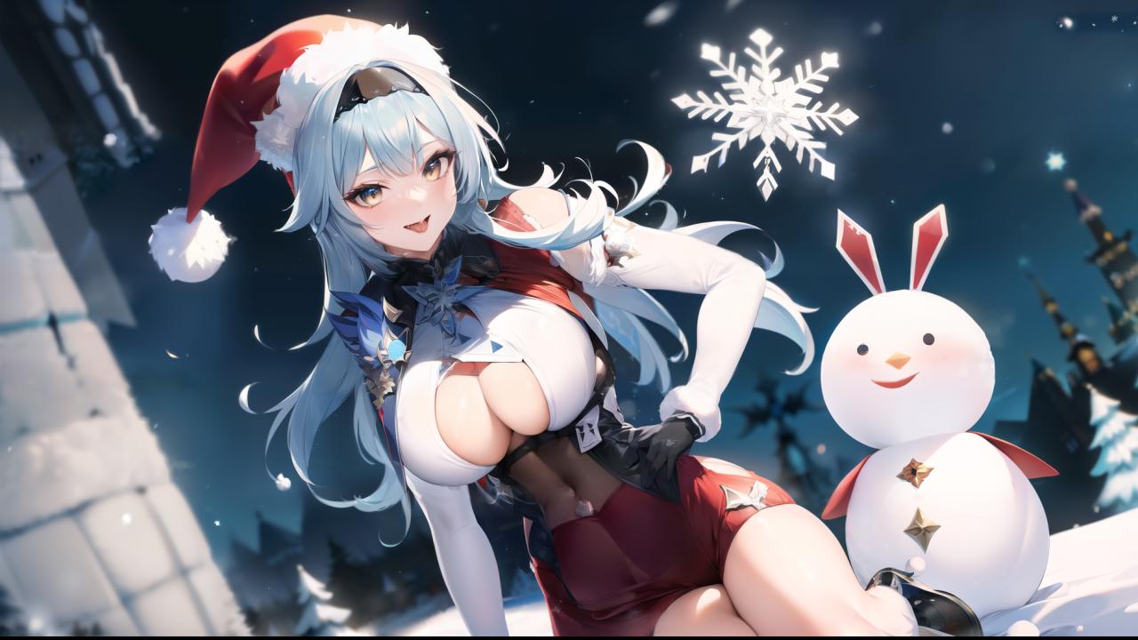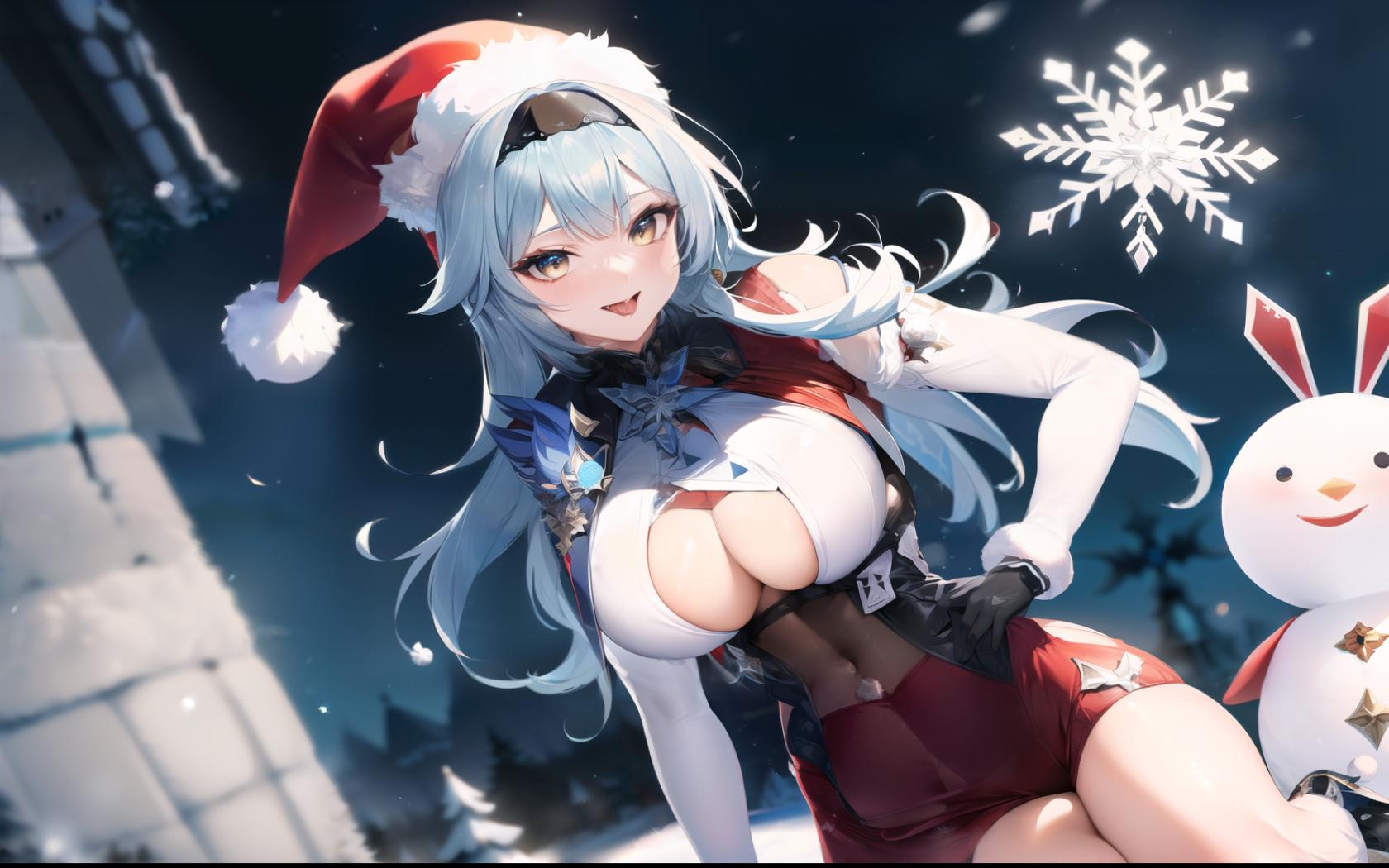 1girl, :d, alternate costume, bangs, black footwear, black gloves, black hairband, blue hair, blurry, blurry background, blush, bodystocking, christmas, cleavage, clothing cutout, covered navel, detached sleeves, fur trim, gloves, hairband, hand on hip, hat, large breasts, long hair, long sleeves, looking at viewer, night, open mouth, outdoors, red headwear, red shorts, red skirt, santa costume, santa hat, shorts, smile, snowflakes, snowman , solo, tongue, tongue out, yellow eyes