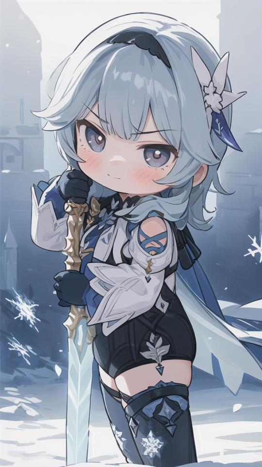 1girl, aged down, bangs, black gloves, black hairband, black thighhighs, blue hair, blush, cape, chibi, closed mouth, gloves, greatsword , grey eyes, hair ornament, hairband, holding, holding sword, holding weapon, long sleeves, looking at viewer, medium hair, necktie, solo, sword, thighhighs, weapon