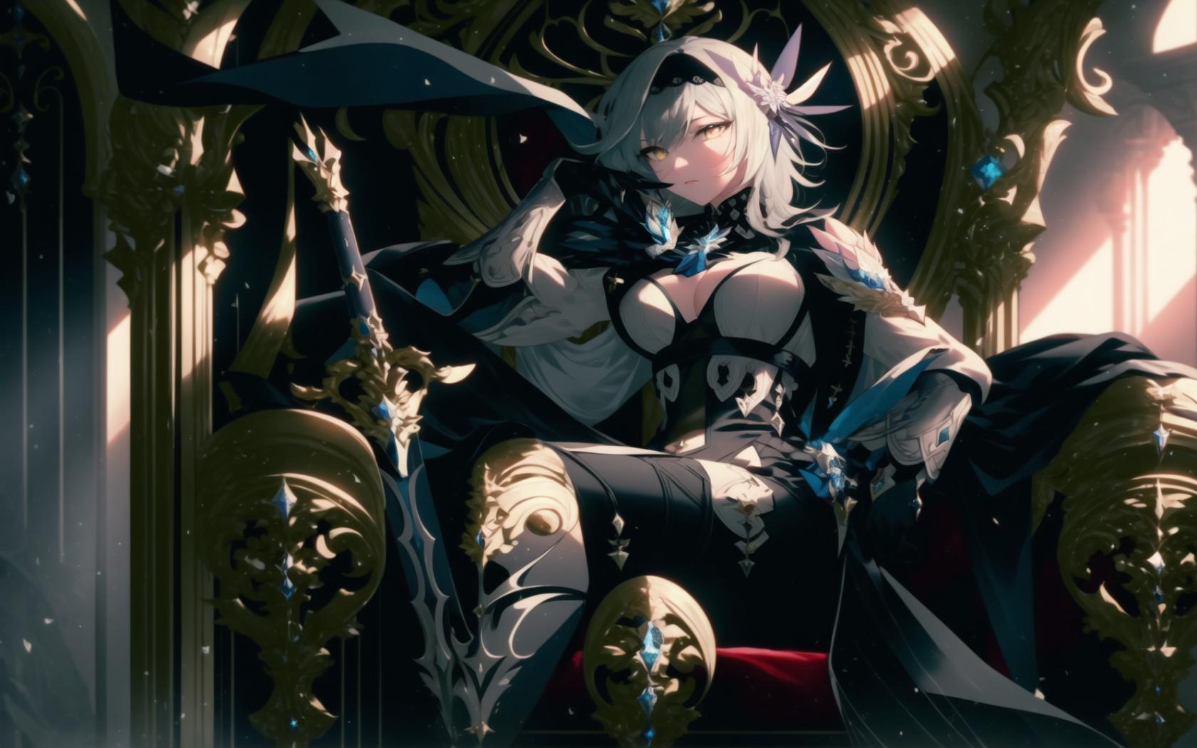 | Prompt | <lora:beautiful-eyes:1> (realistic, perfect artwork), best quality,dynamic pose,sharp focus,(8k), (4k),(Masterpiece), (Best Quality), fantasy, extremely detailed, intricate, hyper detailed, (perfect face), illustration, clearly worked out detail, intricate, cinematic, <lora:eula2:1>euladef,white ornate cape, night, moonrays through window, sitted on a golden ornate throne,sword, hand on chin,bored, queen, looking at viewer, inside a medieval royal king room,tapestries, white marble statues,, 1girl, bangs, braid, breasts, cape, gauntlets, holding, large breasts, looking at viewer, silver hair, sitting, solo, throne, yellow eyes |